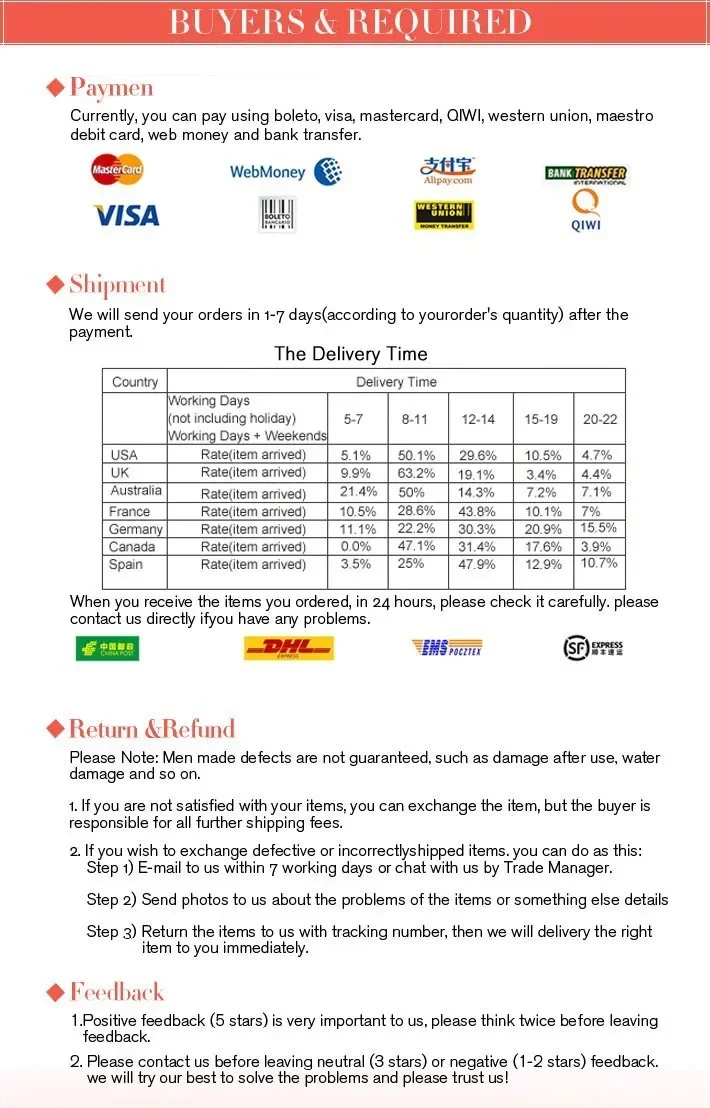 ● Em primeiro lugar, estamos muito gratos por você por escolher nossos produtos. Se você estiver muito satisfeito com nossos produtos, dê-nos um feedback de cinco estrelas. Ou se você tiver alguma dúvida ou opinião, entre em contato conosco. Farei o possível para resolver seus problemas. ● O feedback podemos fazer uma boa otimização e melhoria de nossos produtos, então cada um dos seus comentários para mim, que é importante, continuaremos a progredir no feedback do cliente, para que você tenha um adereço de cosplay perfeito para mostrar na frente de todos.