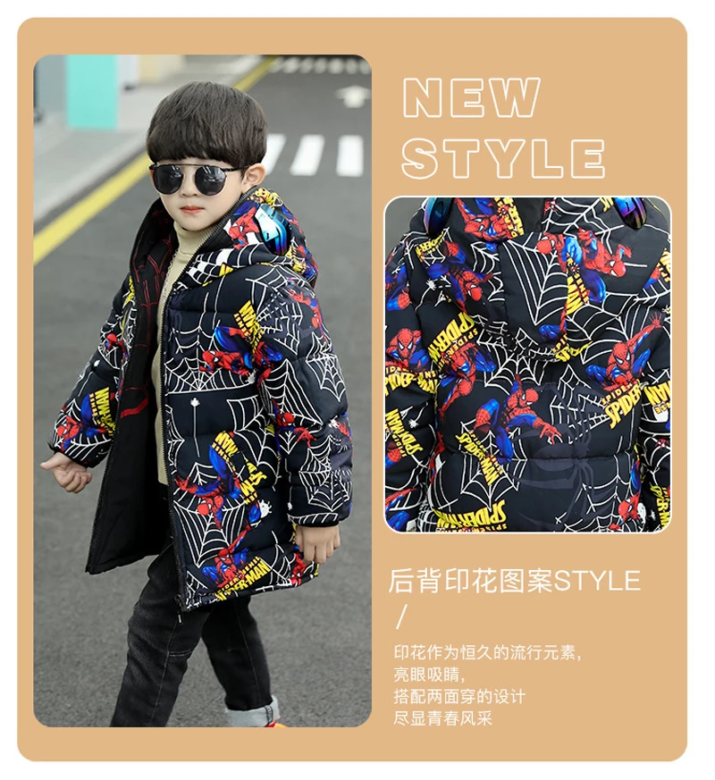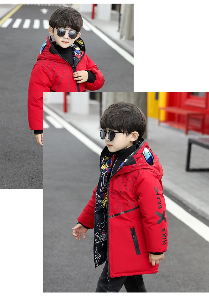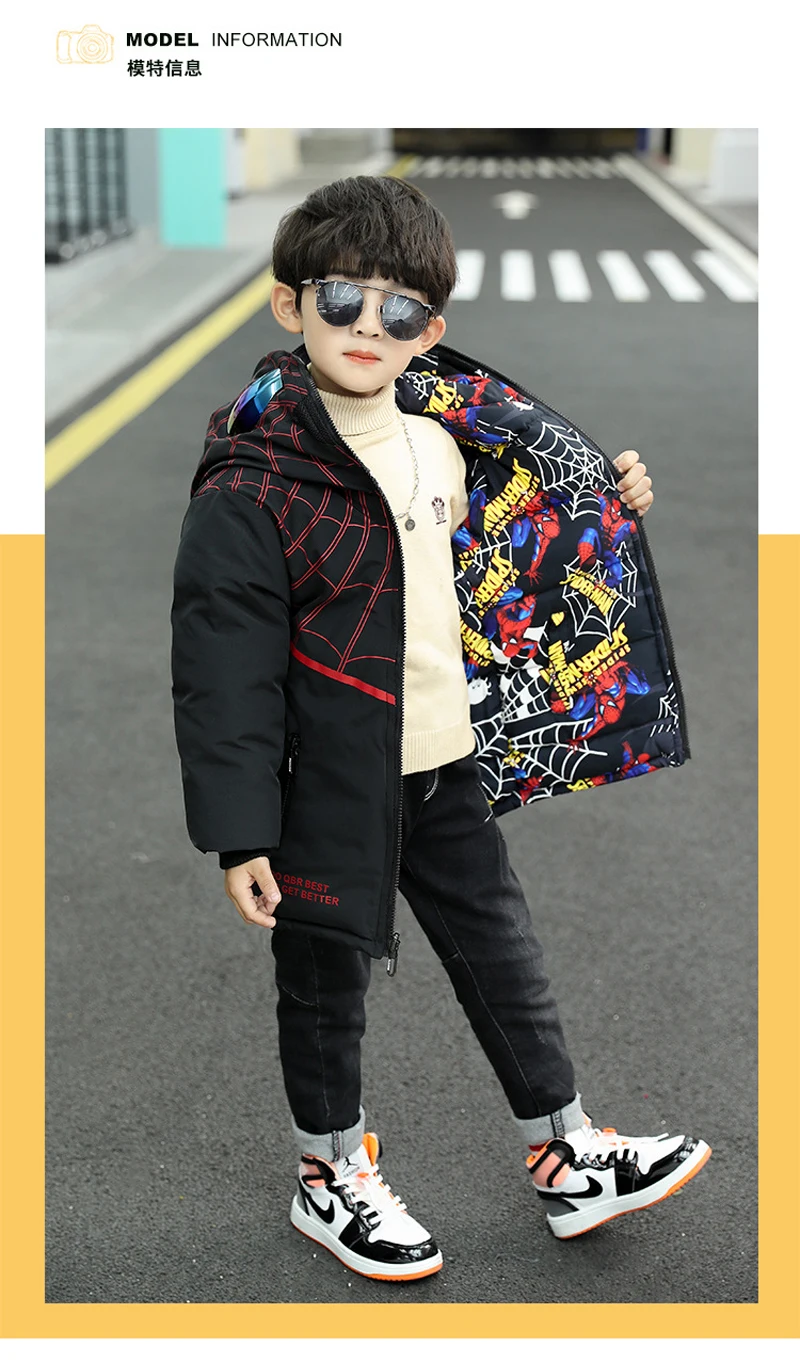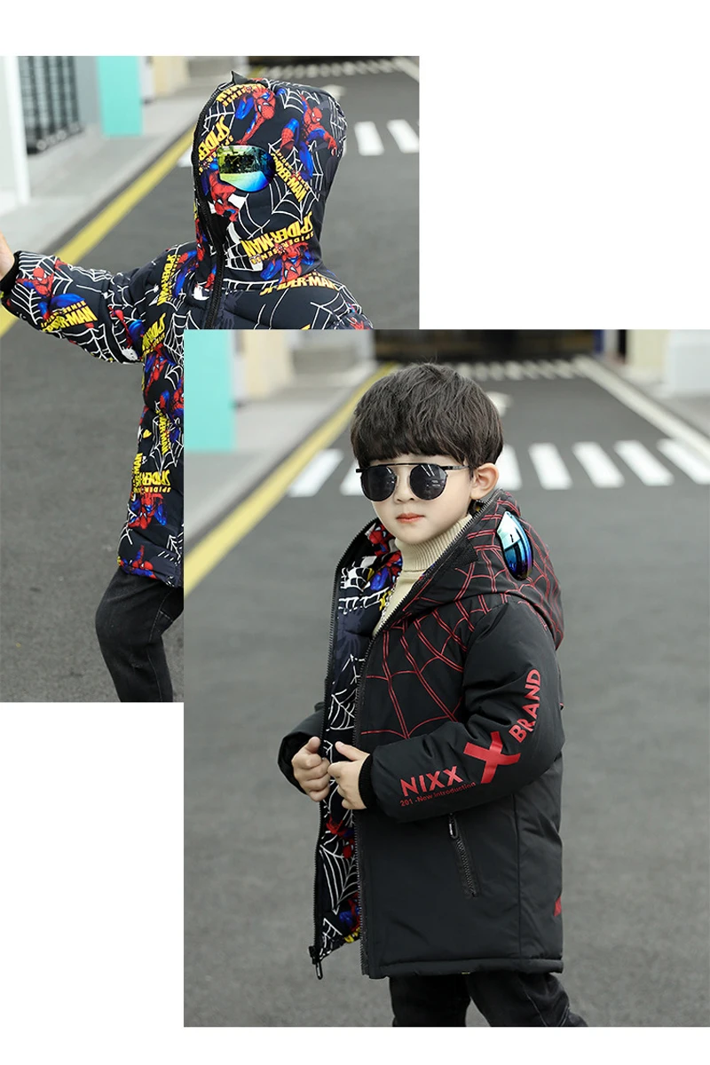 - > Crianças casaco grosso inverno adolescente spiderman menino algodão parka casacos engrossar quente jaquetas longas crianças outerwear pode usar ambos os lados