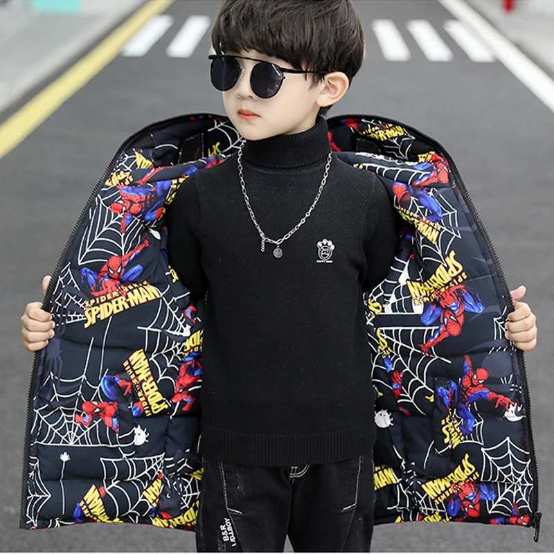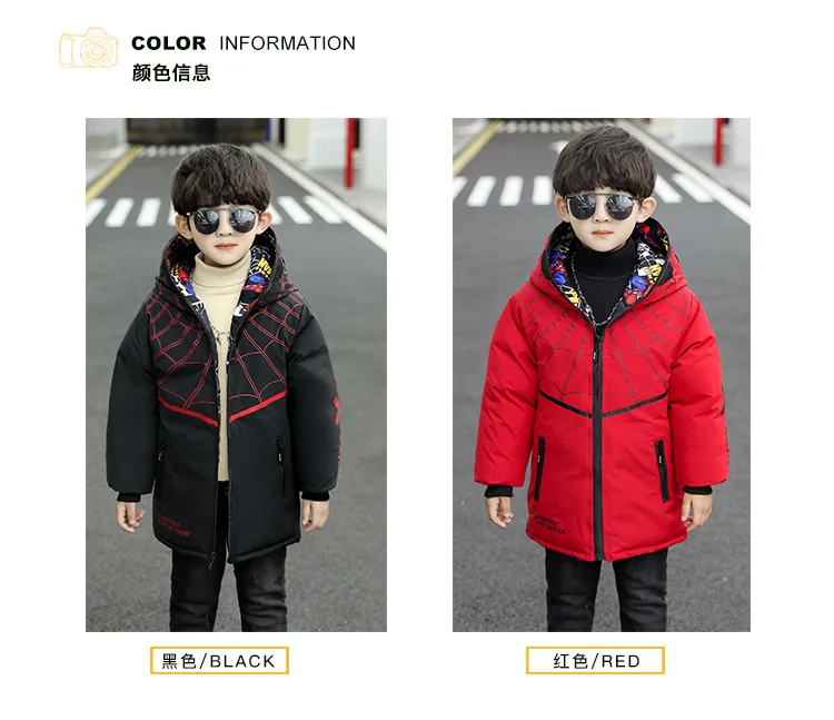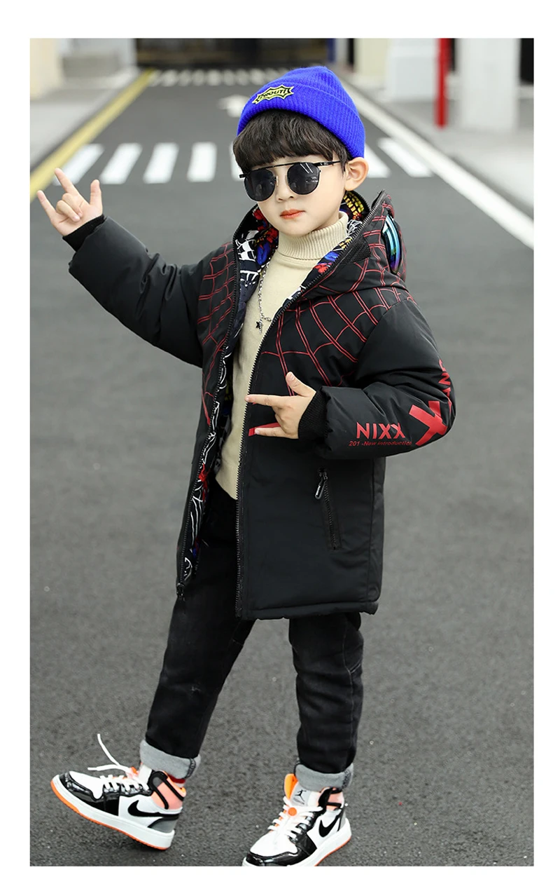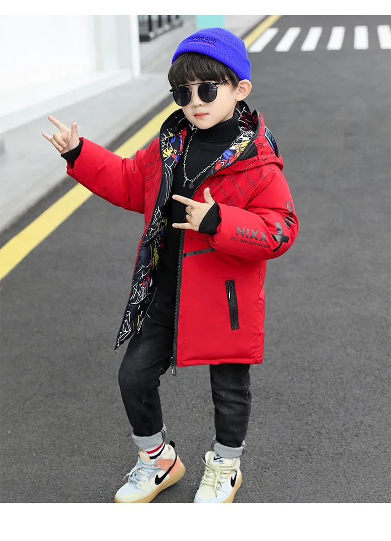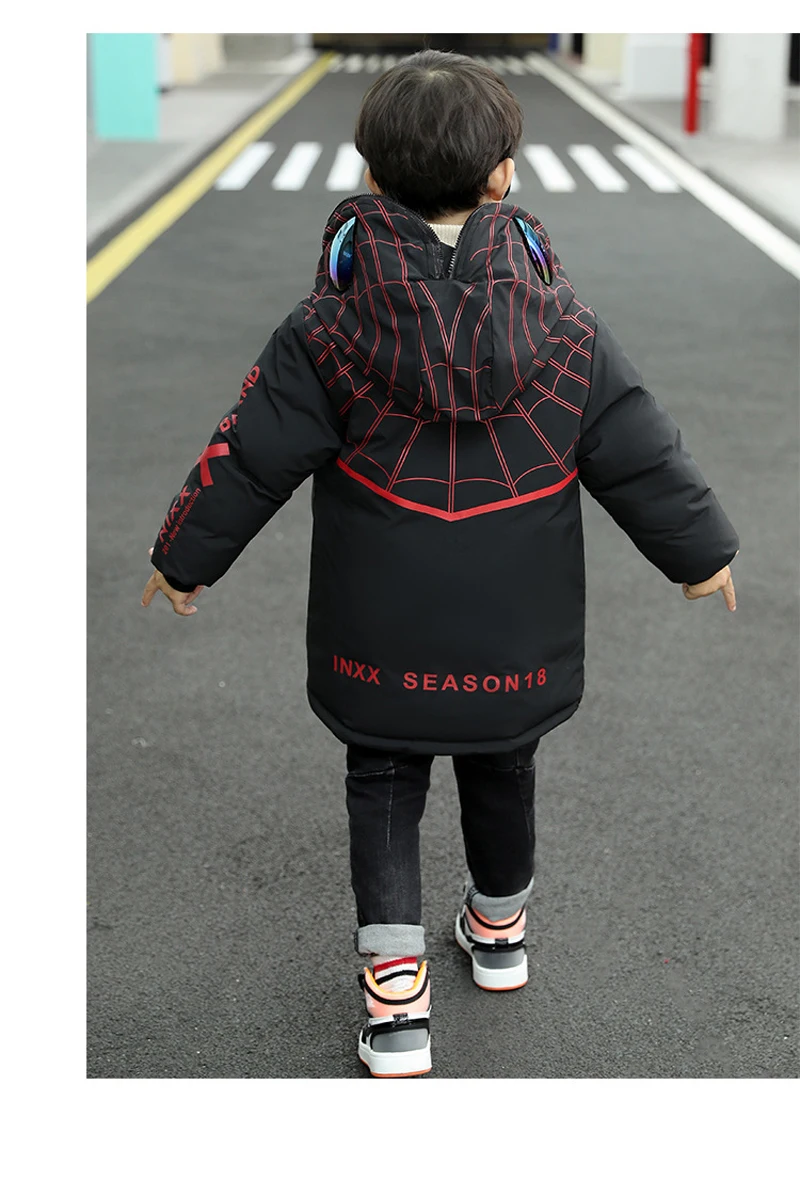 - > Crianças casaco grosso inverno adolescente spiderman menino algodão parka casacos engrossar quente jaquetas longas crianças outerwear pode usar ambos os lados