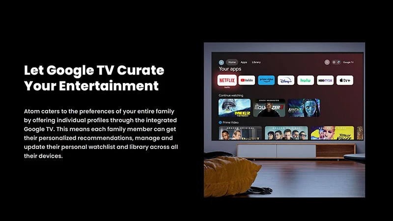 Desfrute de cores vibrantes e pretos profundos com suporte Dolby Vision e transmita seu conteúdo favorito perfeitamente via GoogleTV para uma experiência de visualização aprimorada.
