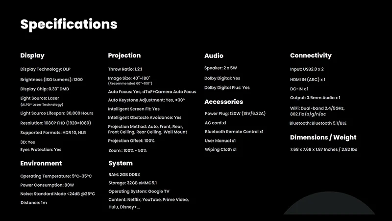 Experimente visuais com qualidade de cinema com brilho de 15.000 lúmens e resolução de 1920x1080dpi, perfeito para experiências de home theater envolventes.