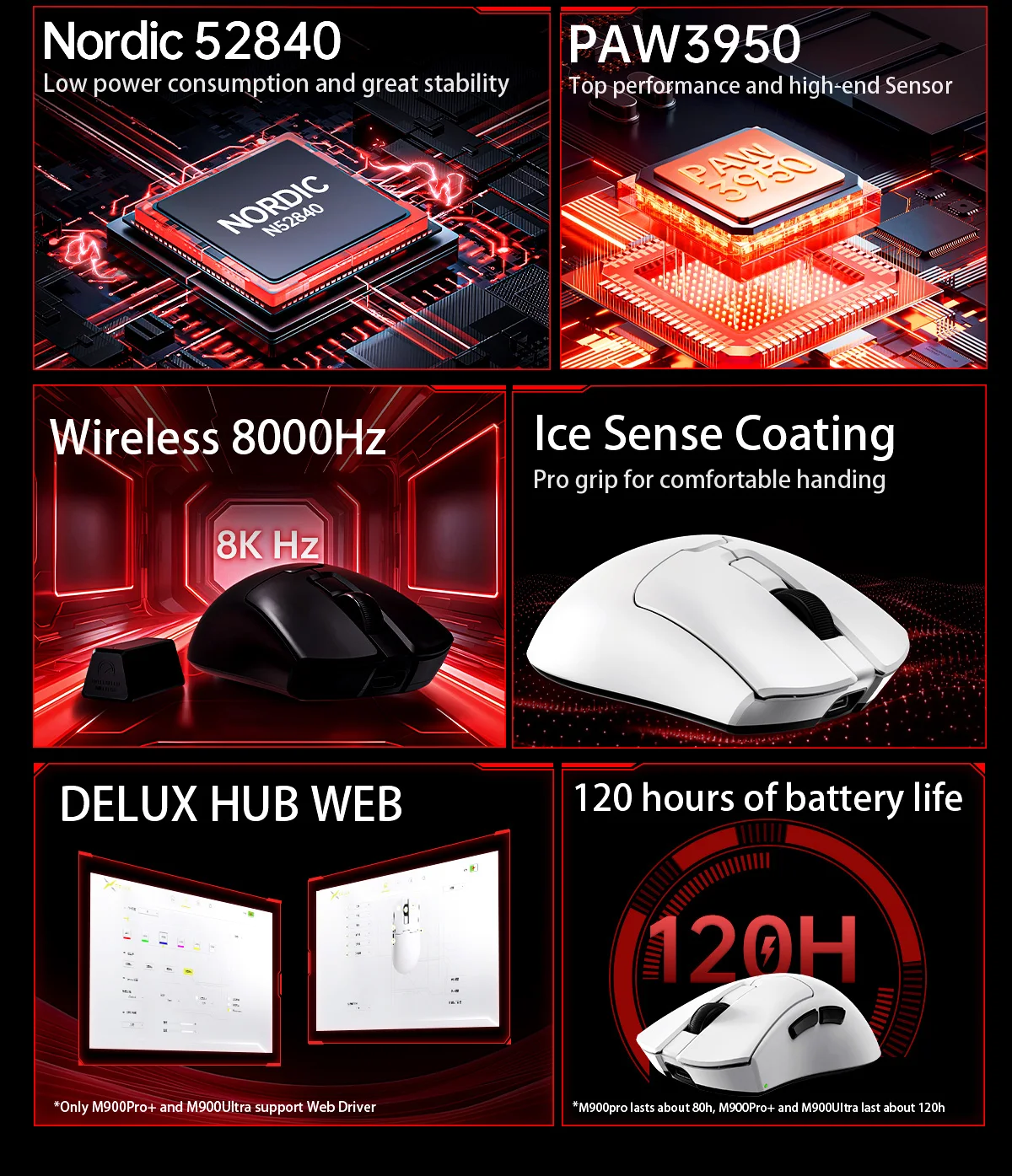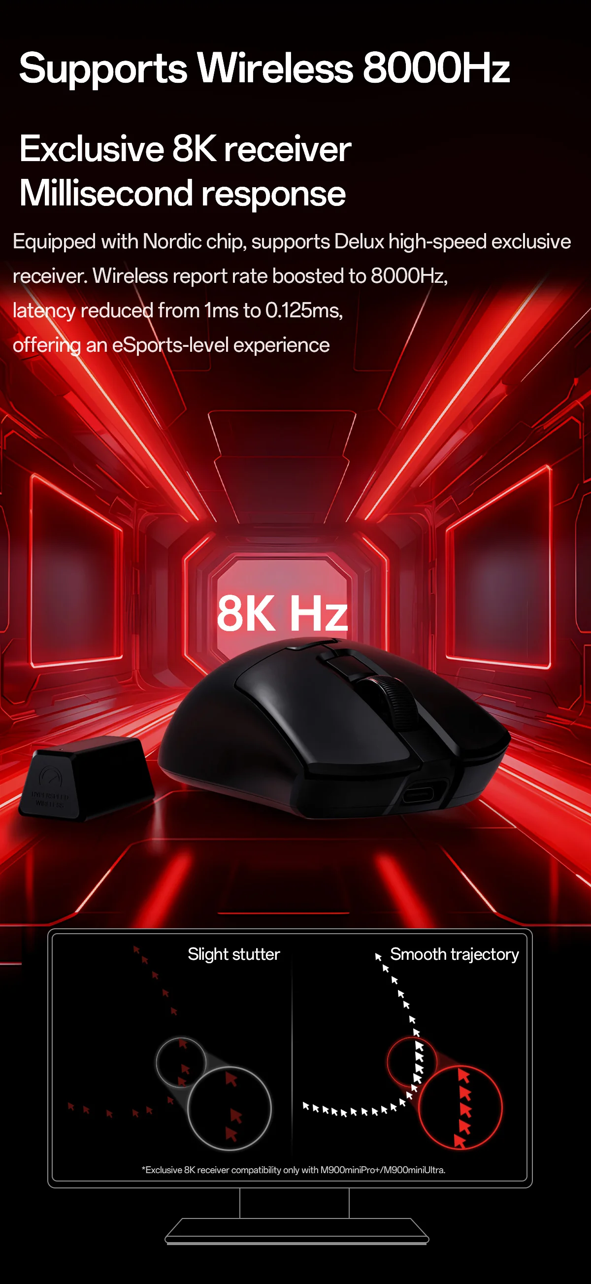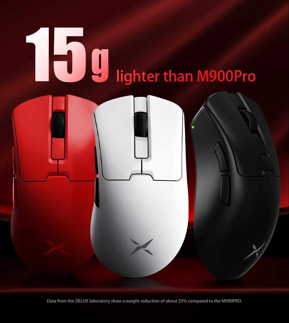 - > Delux m900pro versão ultraleve mouse para jogos sem fio ergonômico 1k/8k taxa de pesquisa 50g paw3395 para mão direita grande pc laptop
