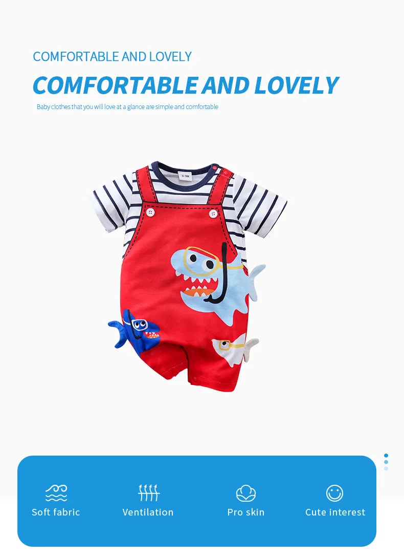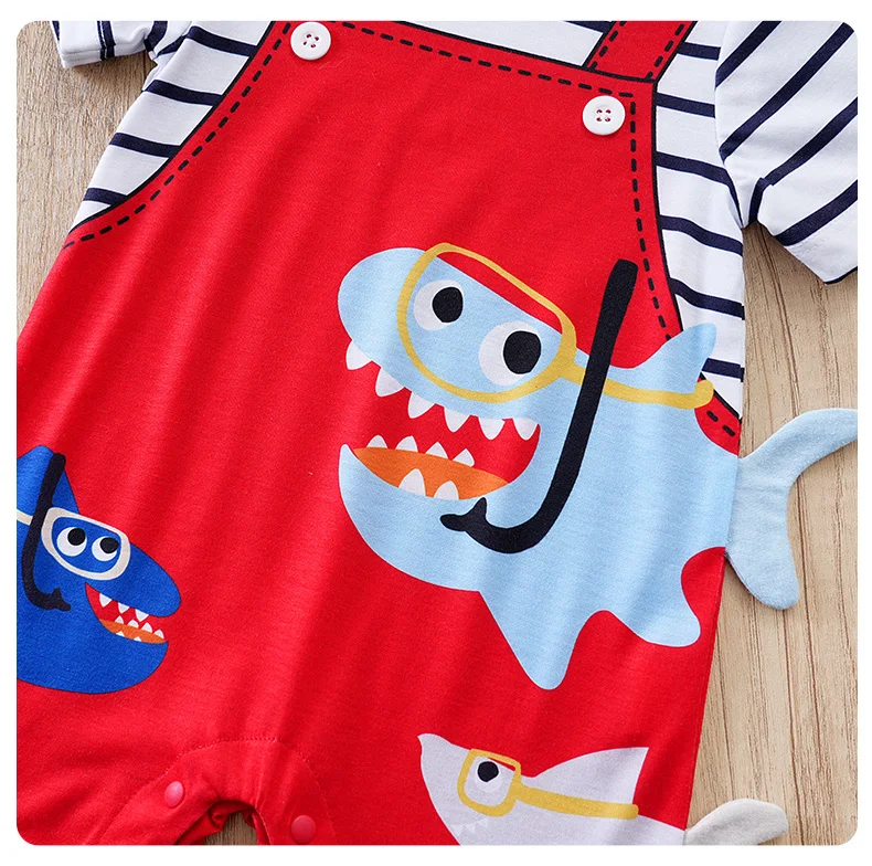 - > Desenhos animados de tubarão 3D recém-nascidos, macacão falso e confortável, meninos e meninas, manga curta, verão, 0-18