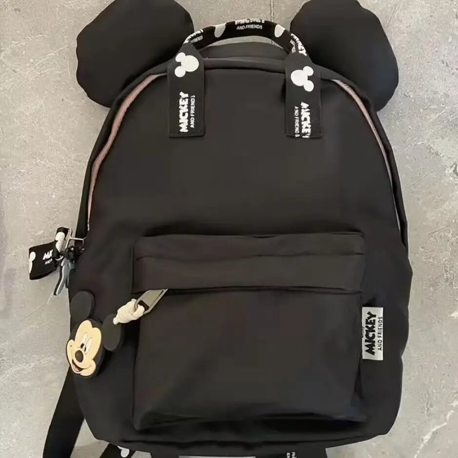 Mochila Mickey Mouse com orelhas levantadas. O bolso frontal do compartimento principal é fechado com um zíper com diferentes encantos de Mickey Mouse no zíper. Impresso alça ajustável e alças duplas.