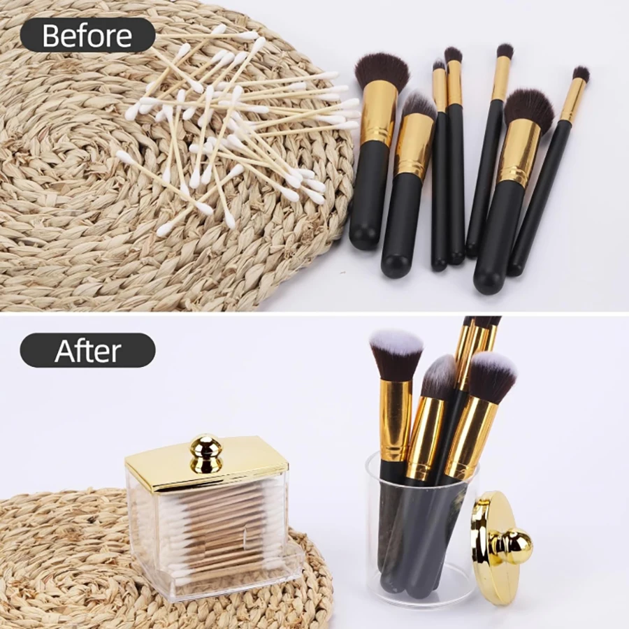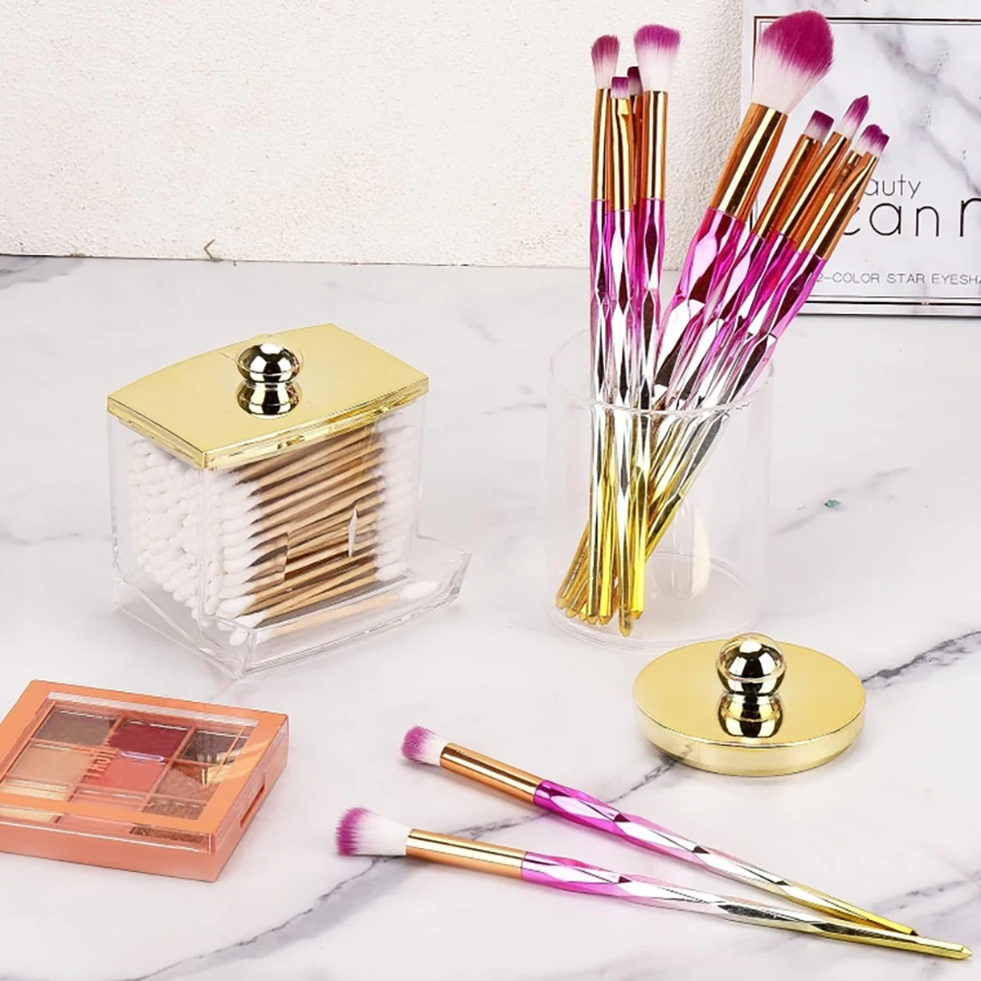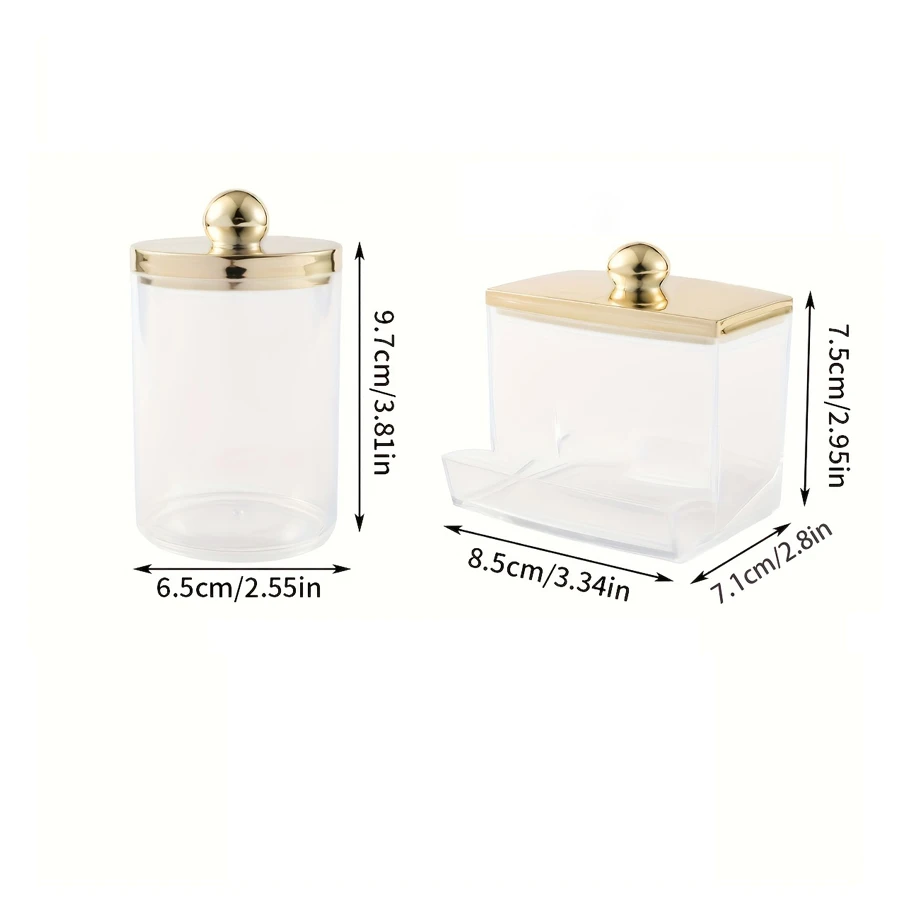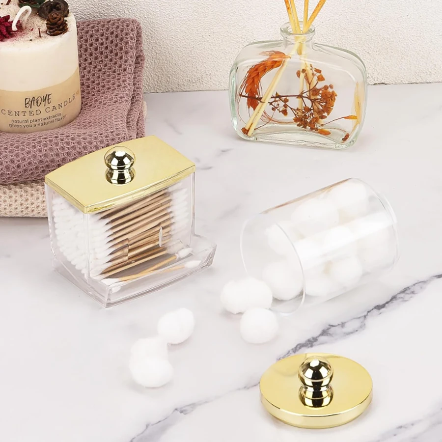 - > Dispensador qtips de 1/2 pacotes, organizadores de banheiro e recipientes de armazenamento, frascos de boticário de plástico com tampas douradas para bola de maquiagem
