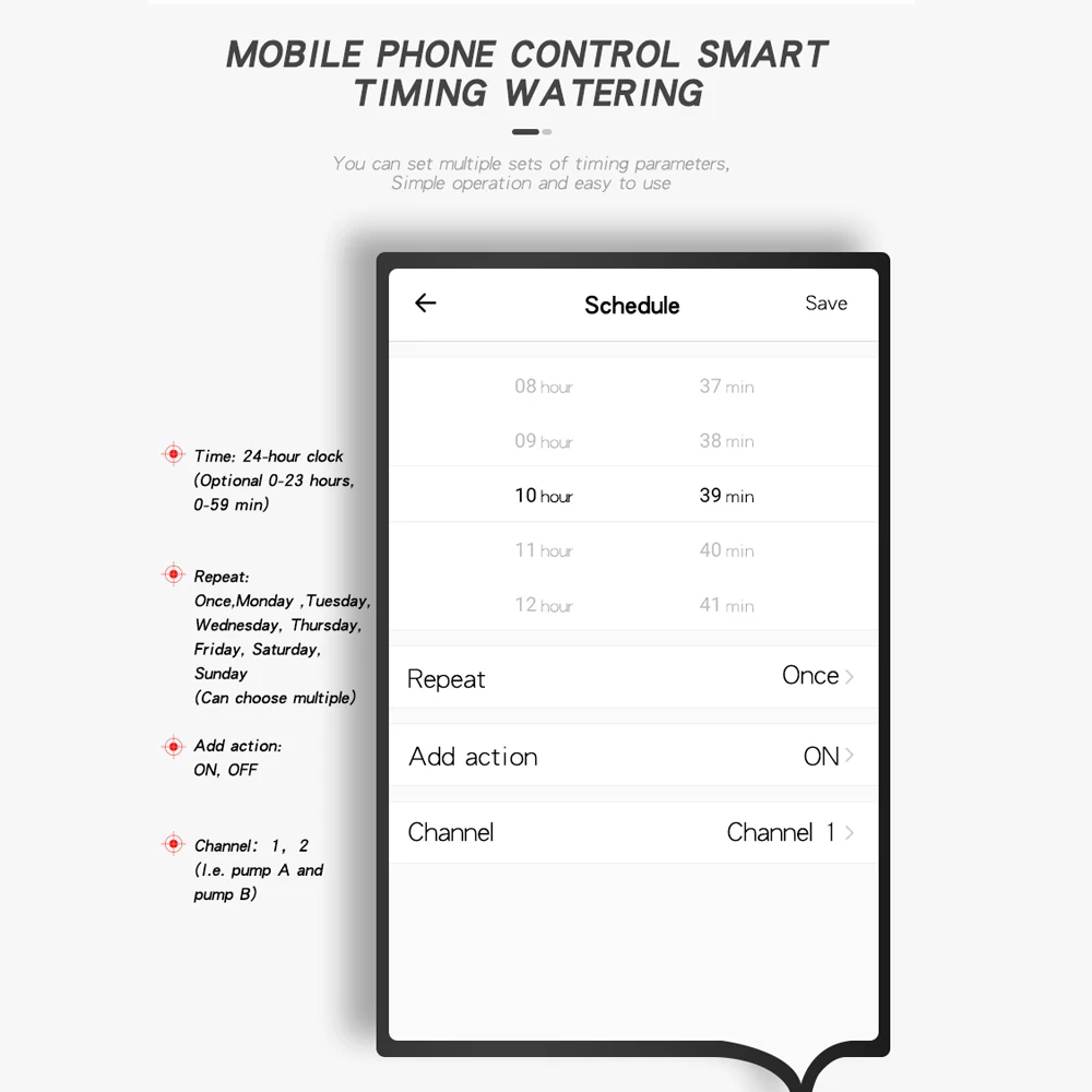 Controle remoto:Suporte ao controle APP (eWeLink), você pode definir a frequência de irrigação, tempo de irrigação único, irrigação cronometrada, etc., compatível com sistemas iOS e Android.