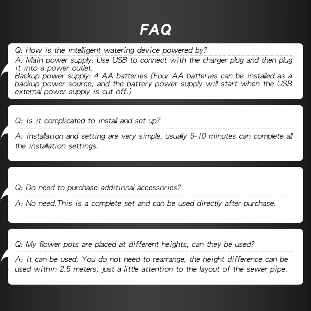 O dispositivo de rega automático inteligente pode regar as plantas regularmente e quantitativamente com configurações simples.Mesmo se você estiver em vocação ou fora, não precisa se preocupar com irrigação não tripulada.É adequado para casa, escritório, jardim, terraço, laboratório, agricultura, etc.