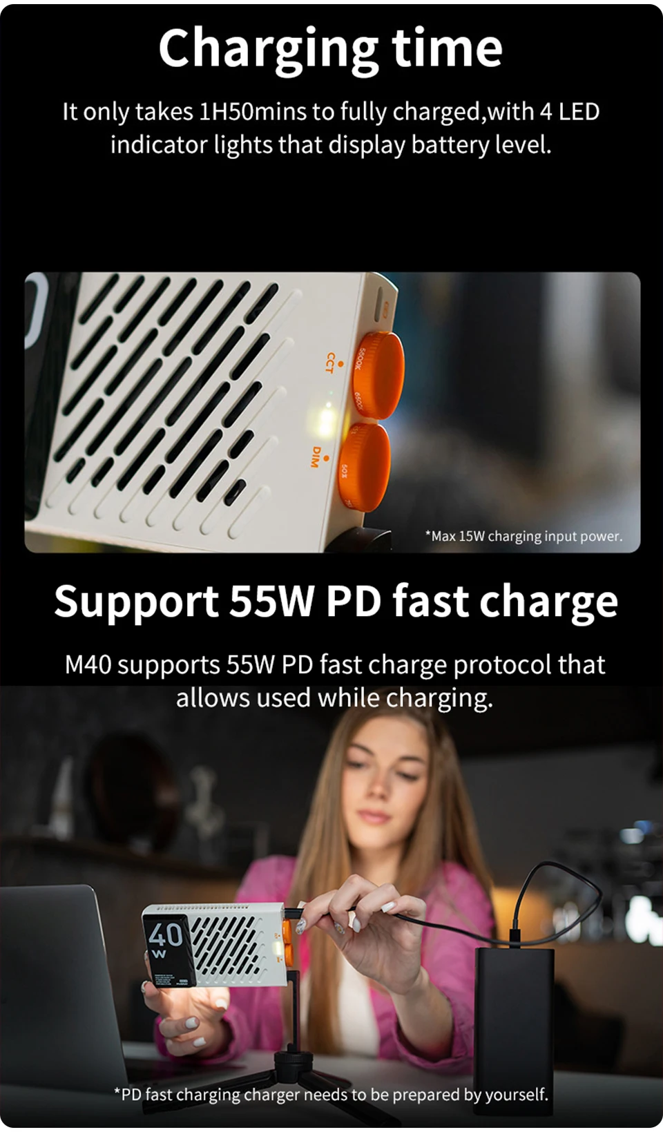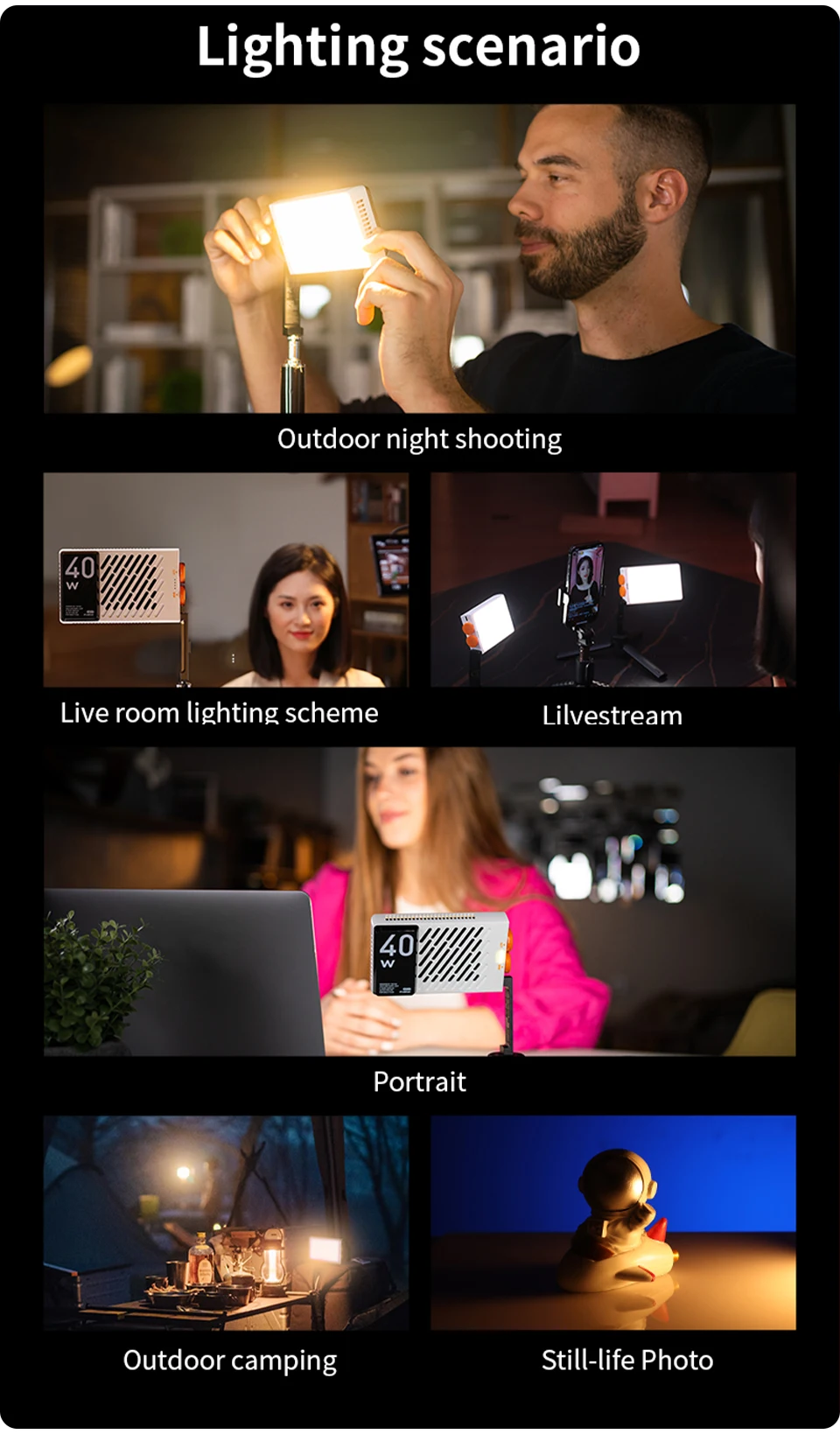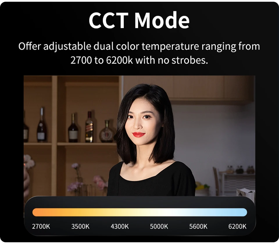 Oferece temperatura de cor dupla ajustável, variando de 2700K a 6200K, sem estroboscópios.