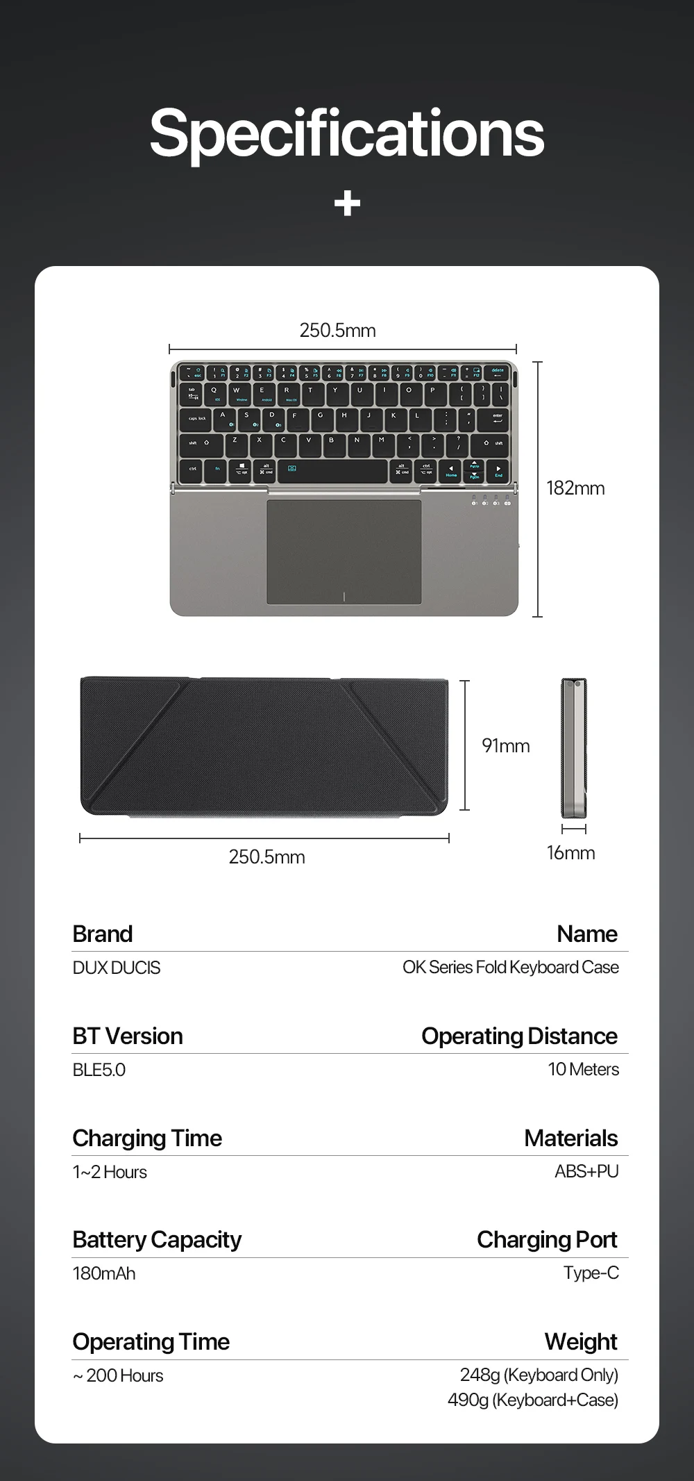 - > DUX DUCIS Teclado dobrável Bluetooth 5.0 com touchpad e suporte para telefone para telefones, tablets, PC iOS Android Windows Mac