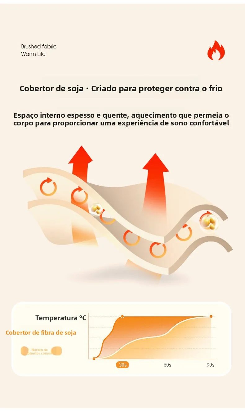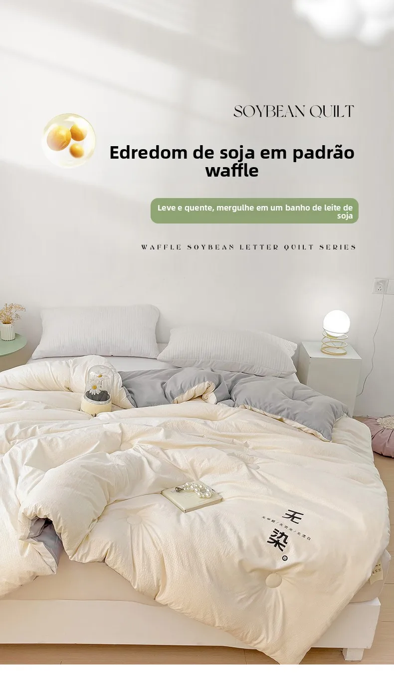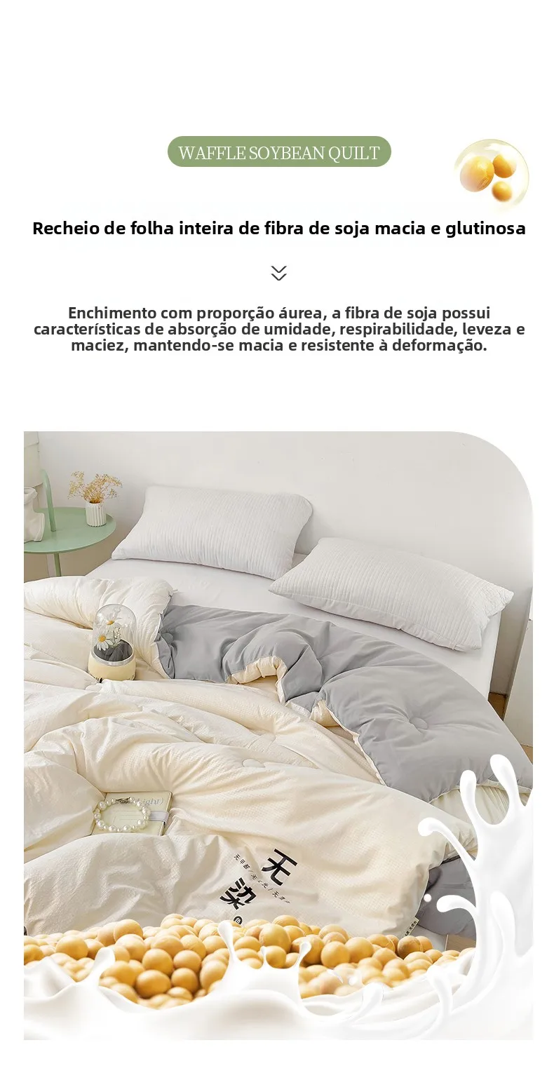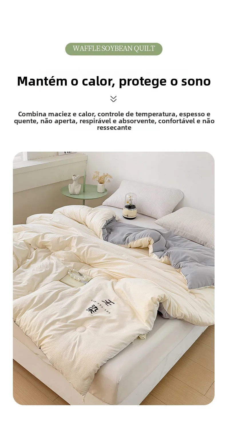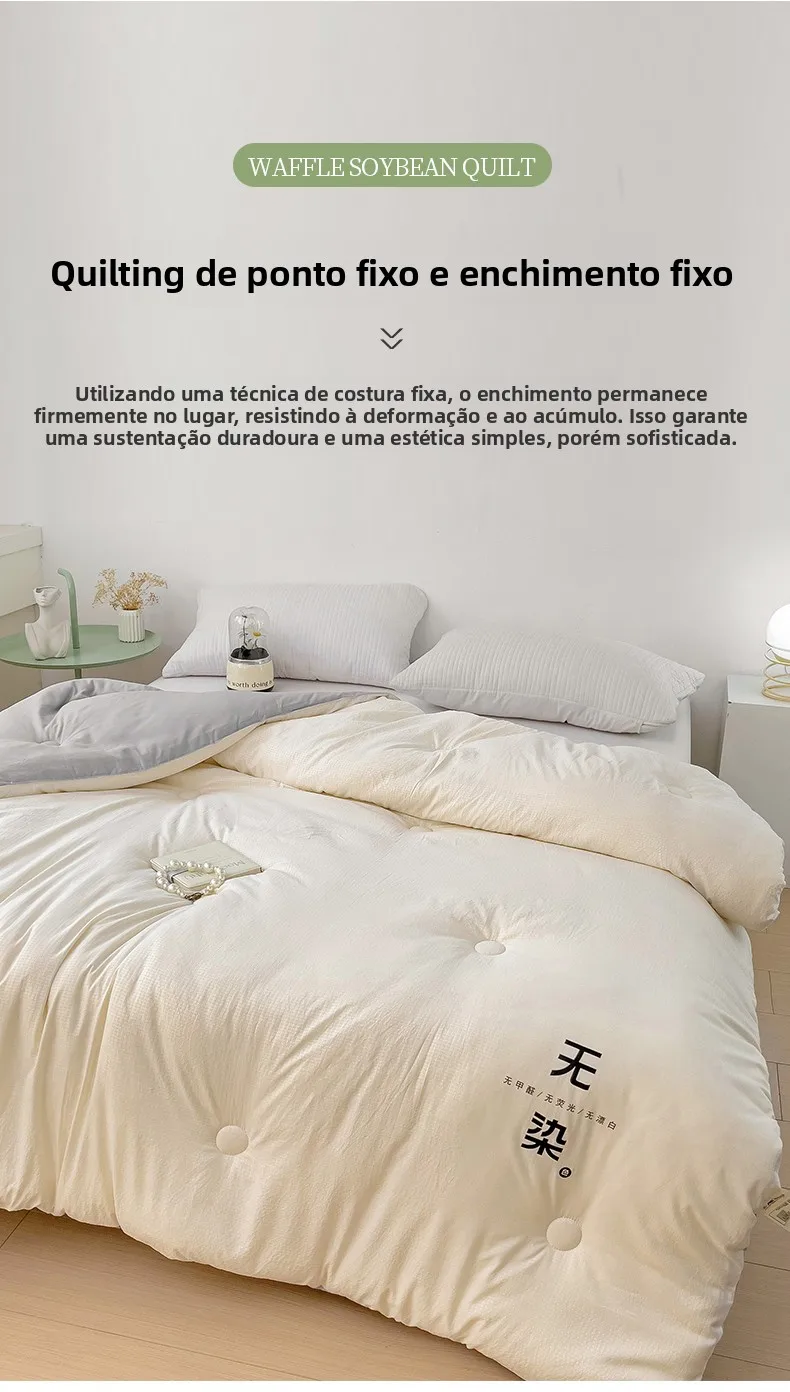 Este edredom é feito de 10% de fibra de soja e 90% de fibra de penas, proporcionando calor e conforto inigualáveis.