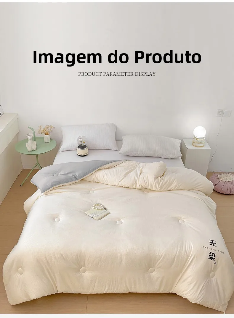 O edredom possui uma capa de algodão lavado, garantindo durabilidade e resistência ao uso diário.