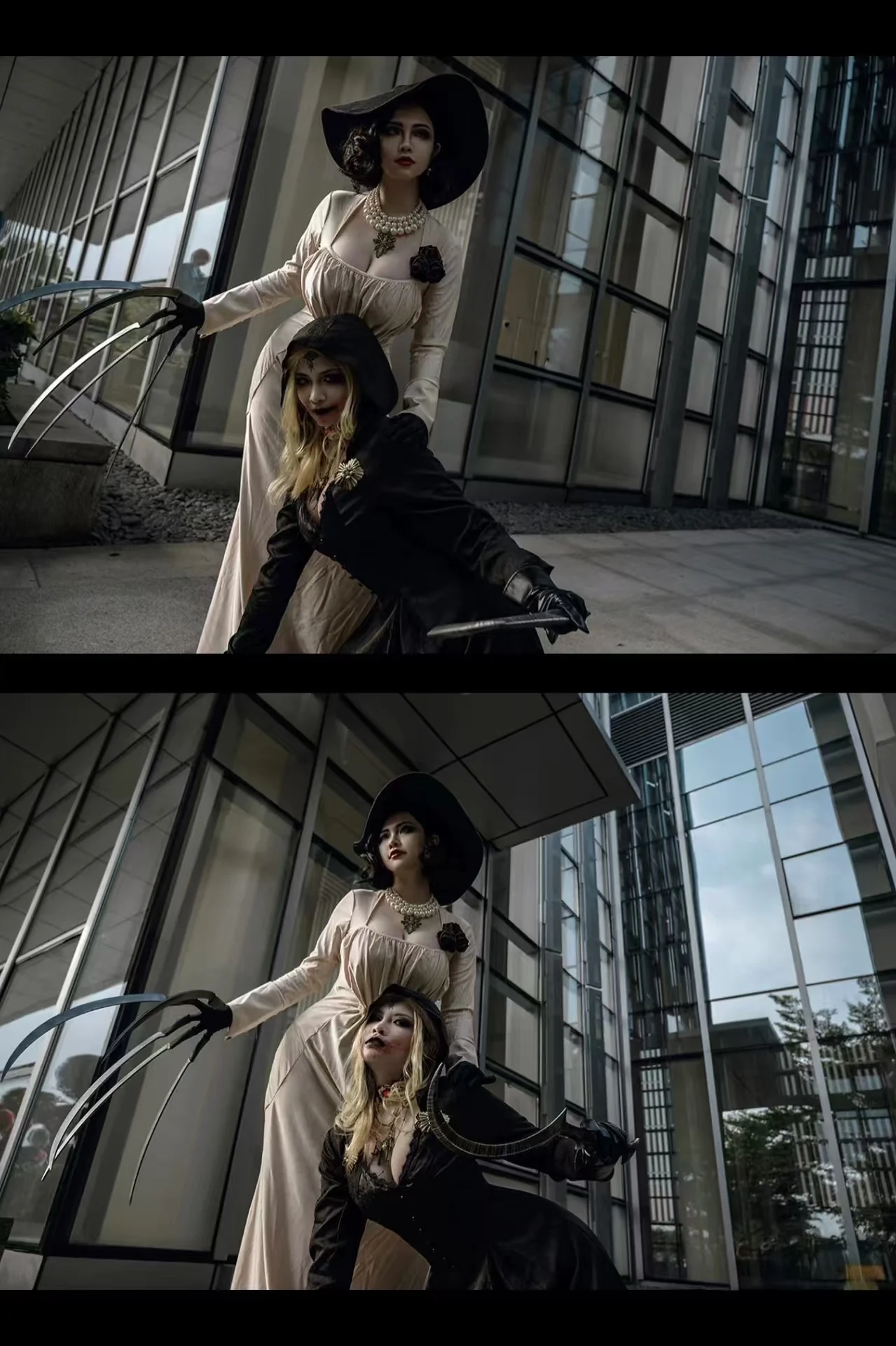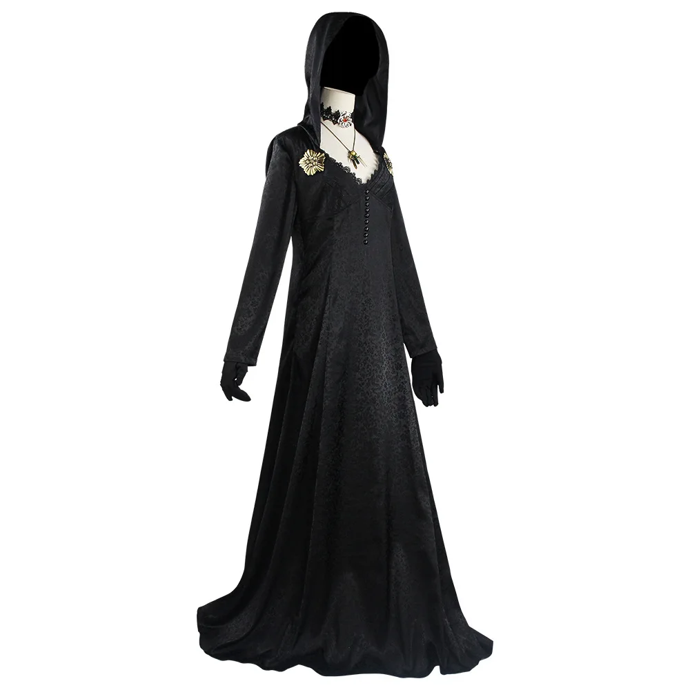 - > Em estoque traça senhora mal cosplay fantasia aldeia vampiro senhora dimitrescu traje feminino vestido preto halloween carnaval festa terno