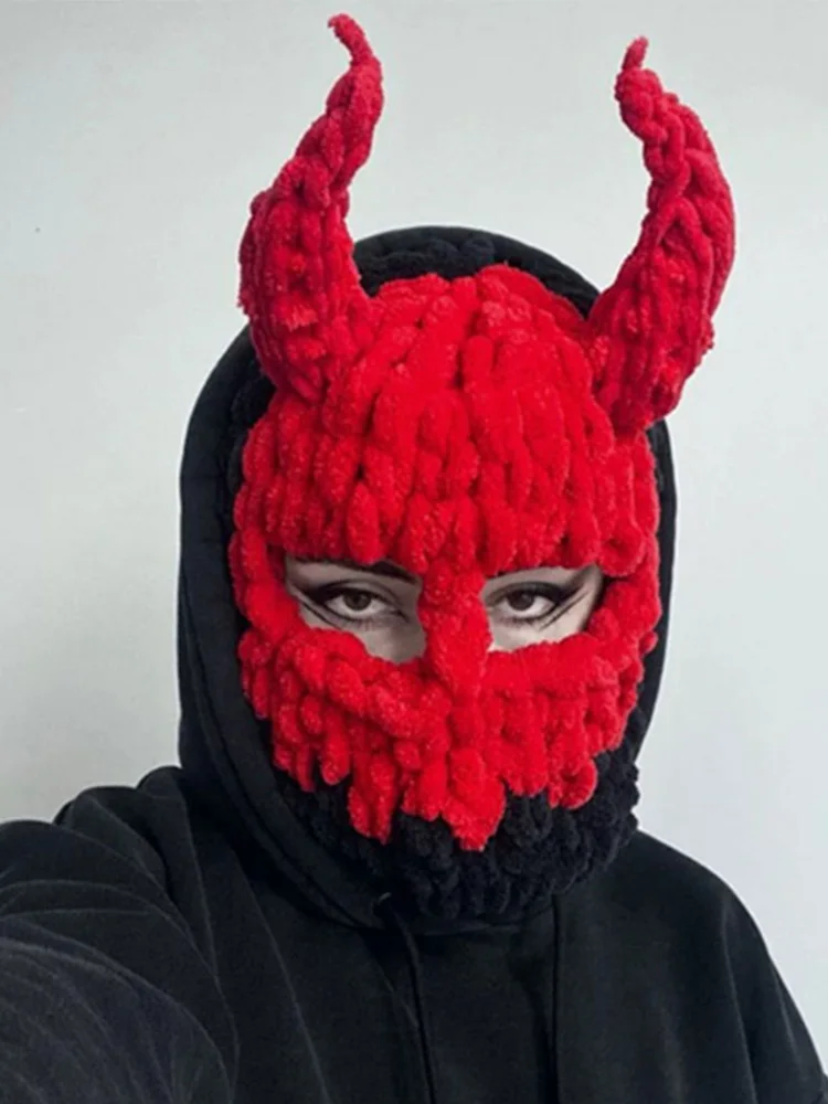 Engraçado chifres do diabo criativo chapéu de malha quente capa facial completa quente legal máscara para mulher homem inverno halloween cospaly adereços