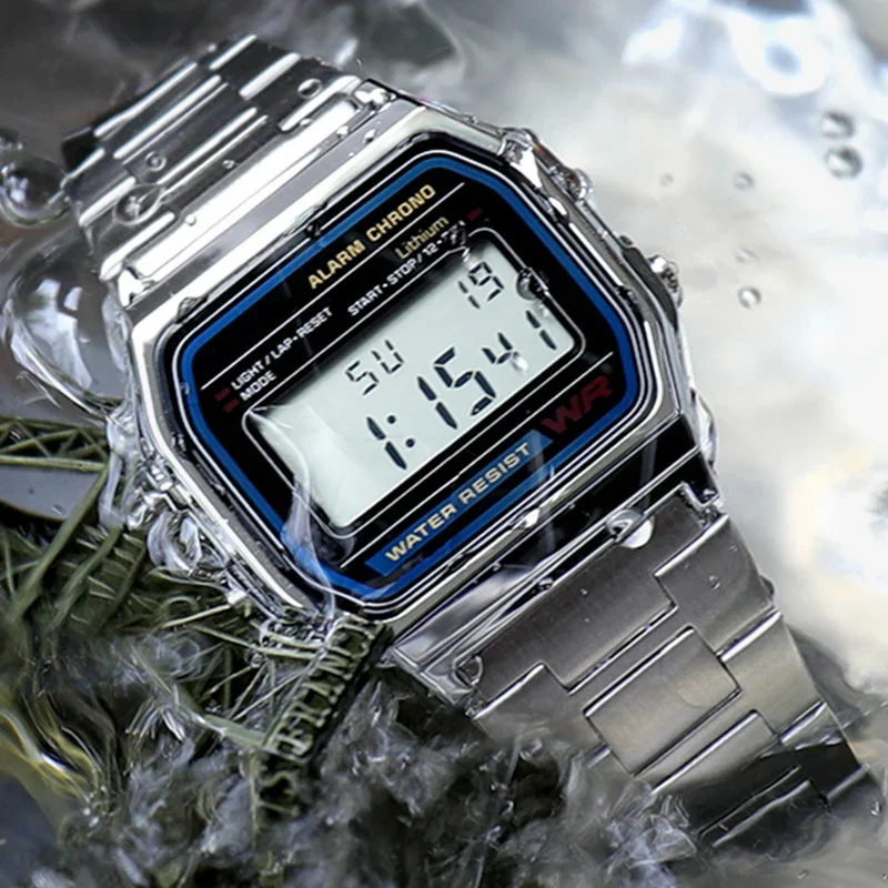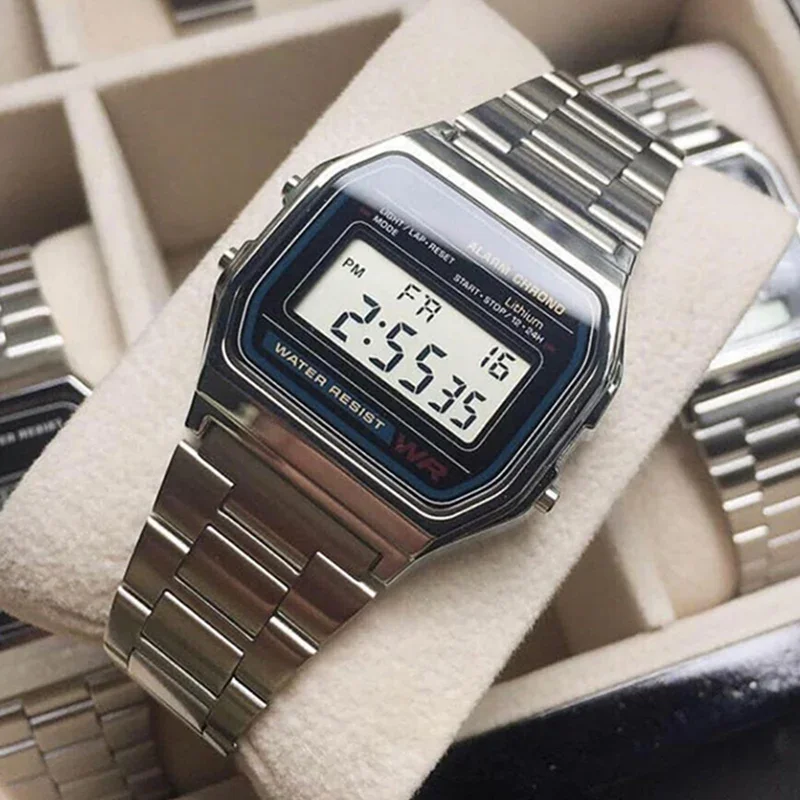 - > F91w banda relógio à prova dwaterproof água retro digital de aço inoxidável esportes militar relógios das mulheres dos homens relógio de pulso eletrônico digital