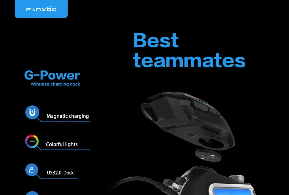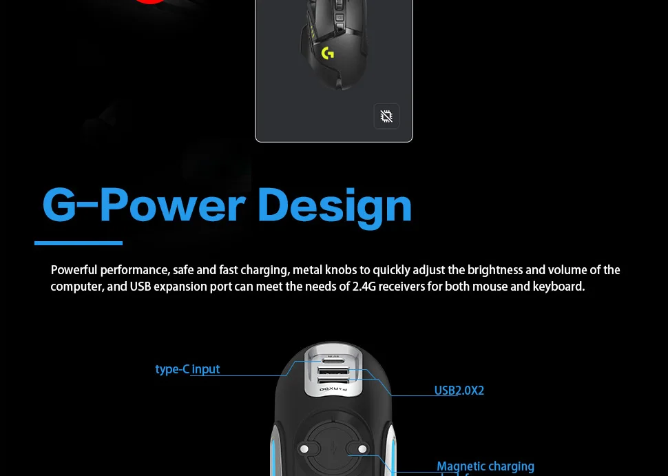 - > Fanxoo g-power mouse doca de carregamento sem fio para logitech g502 g502x plus gpw g903 com luz rgb botão de controle de volume do computador