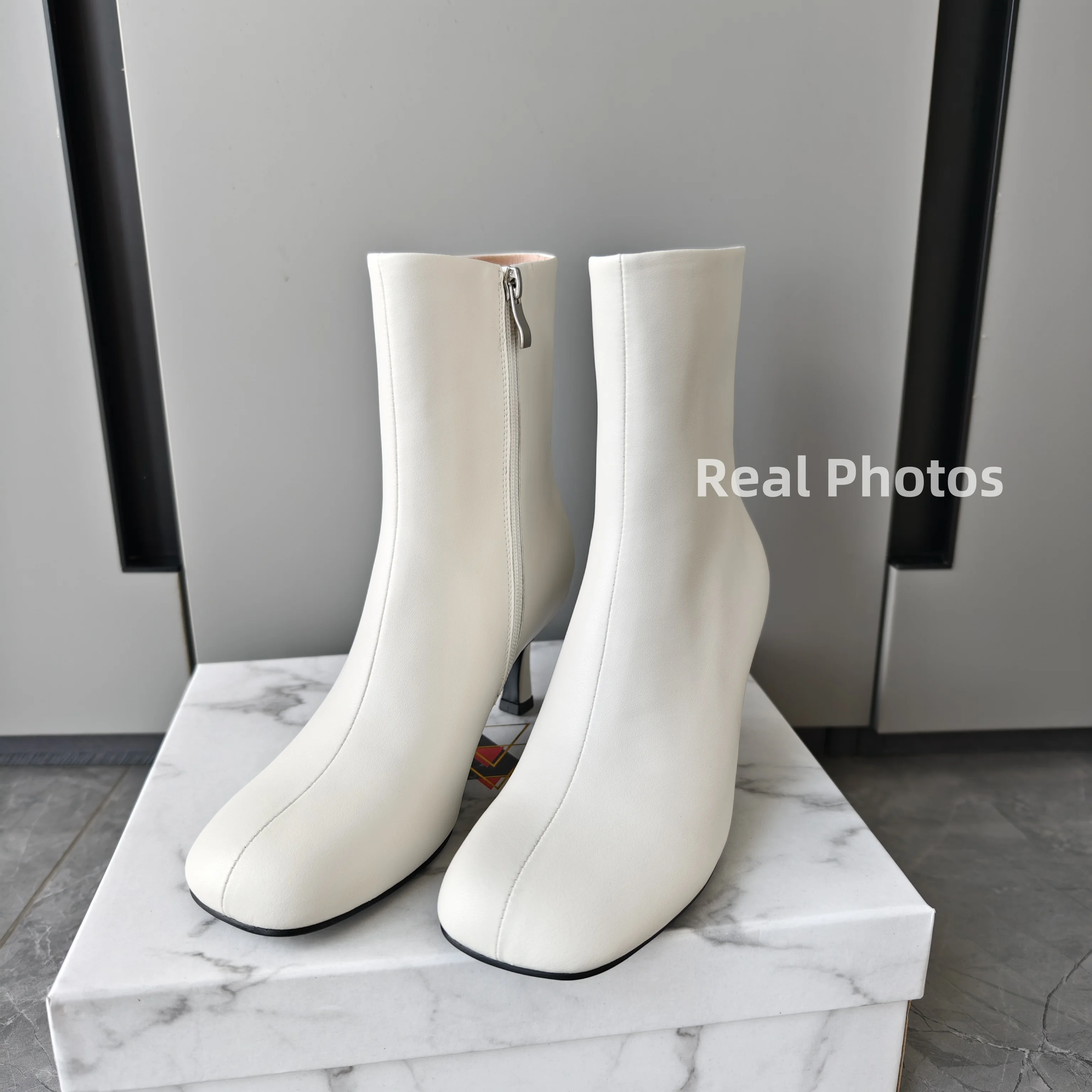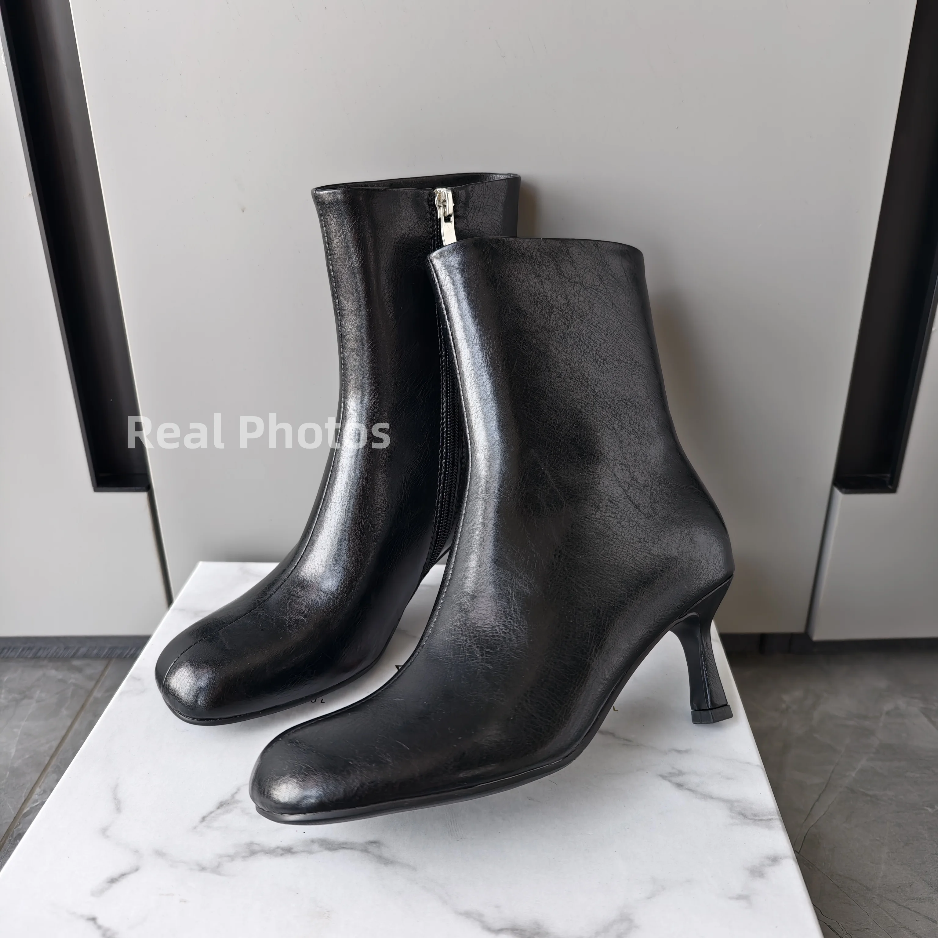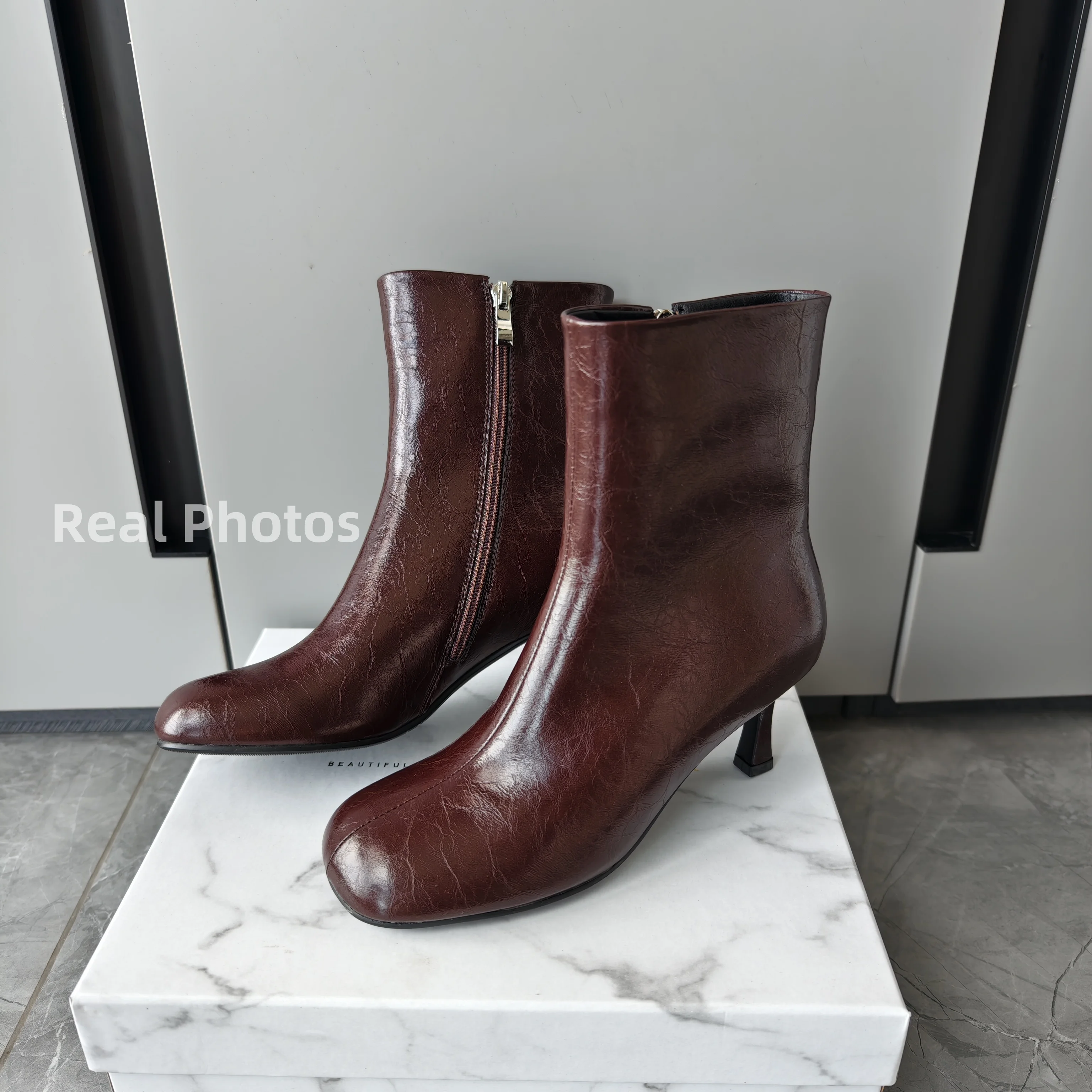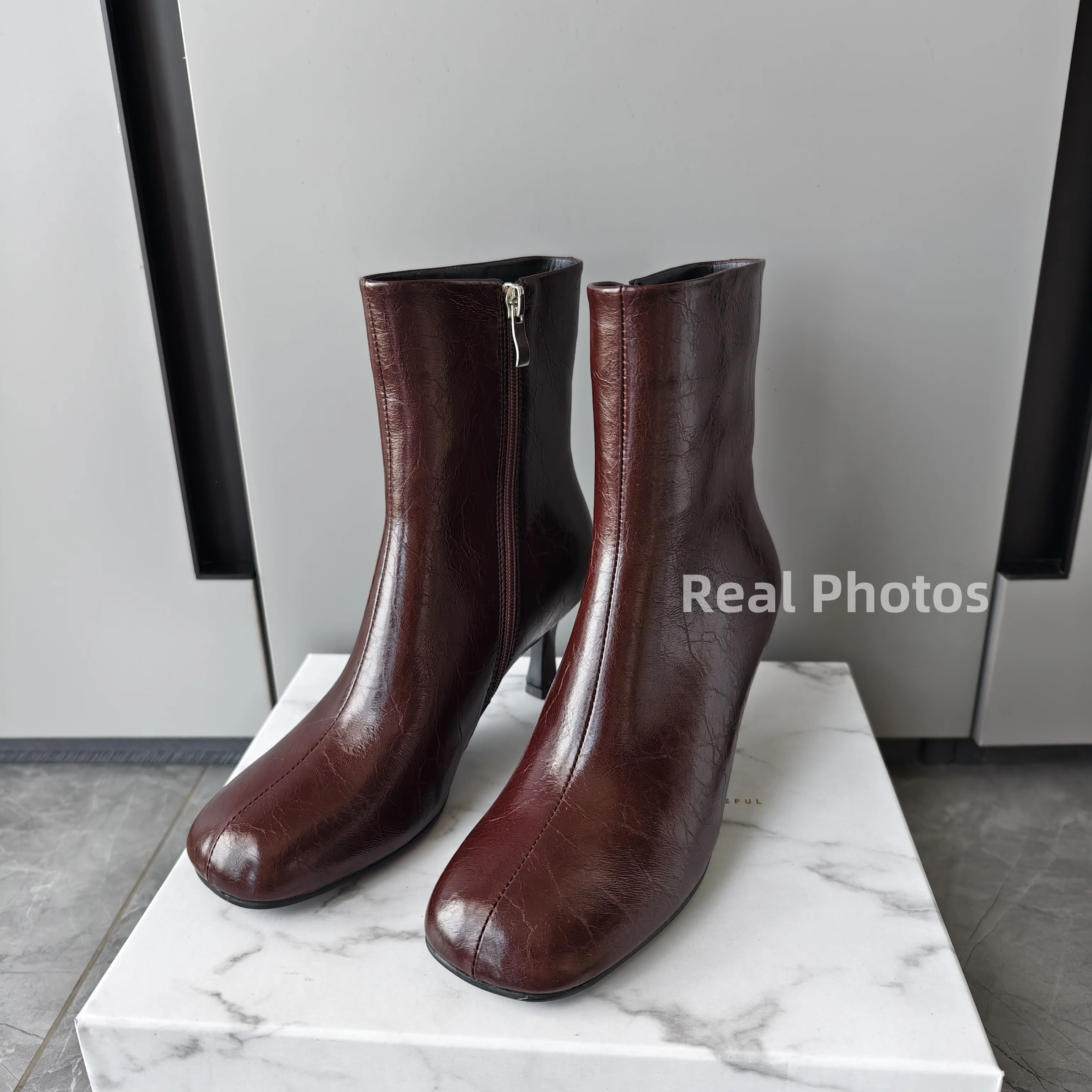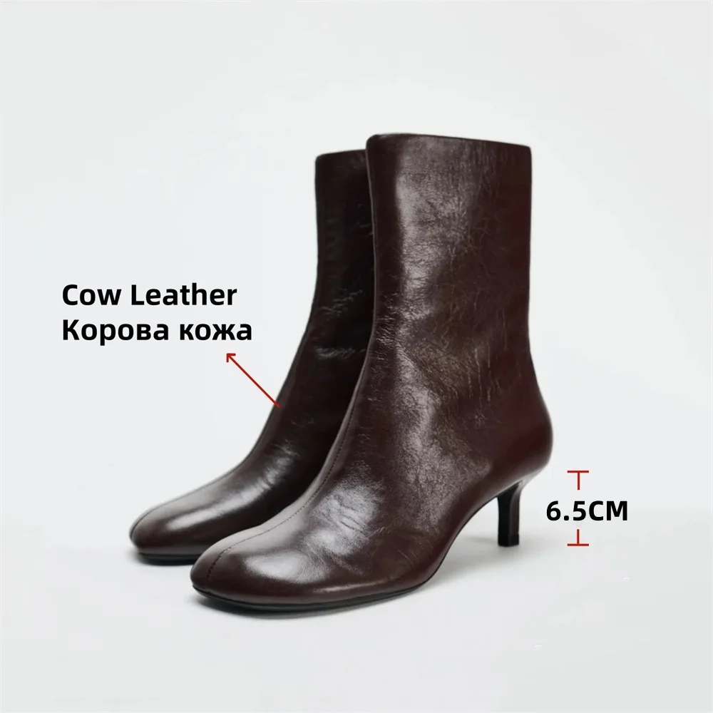 - > Fedonas moda feminina couro genuíno fino salto alto quente outono inverno botas de tornozelo dedo do pé redondo curto elegante botas curtas sapatos