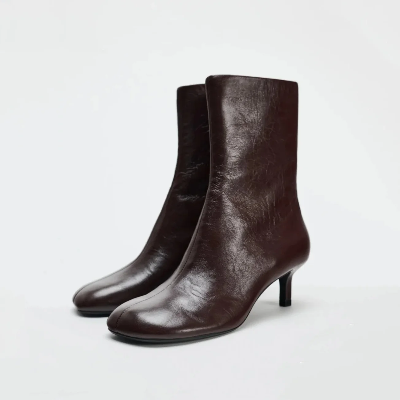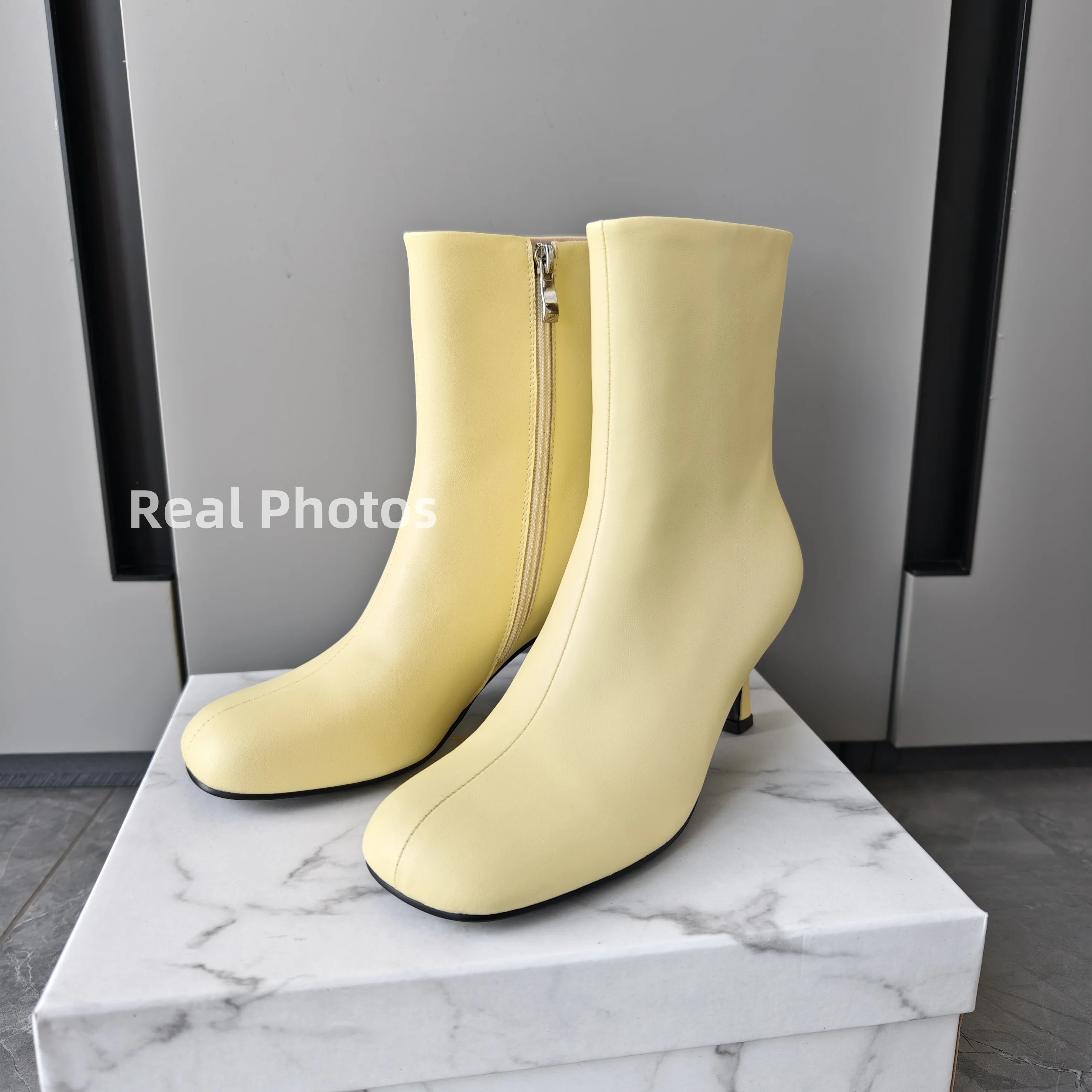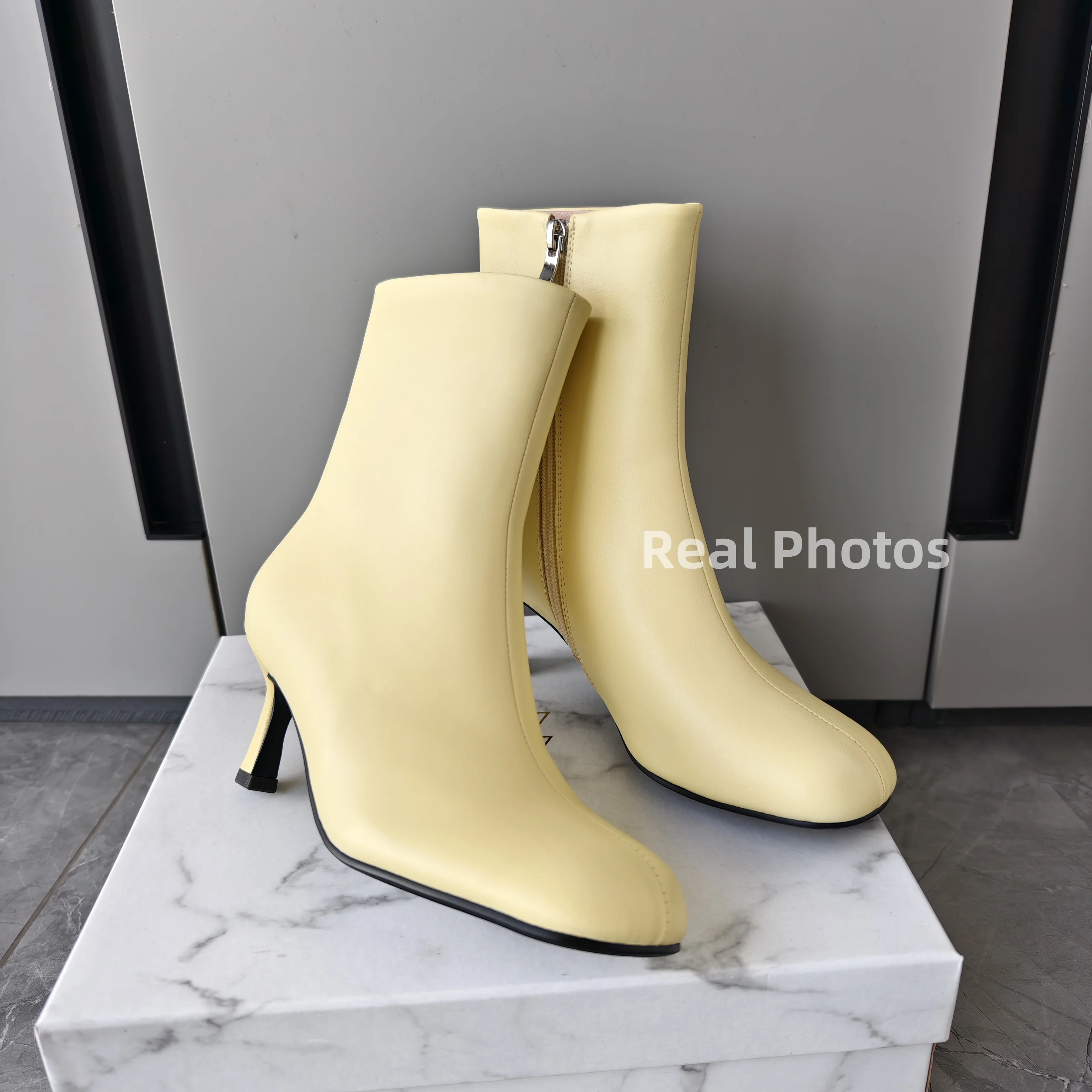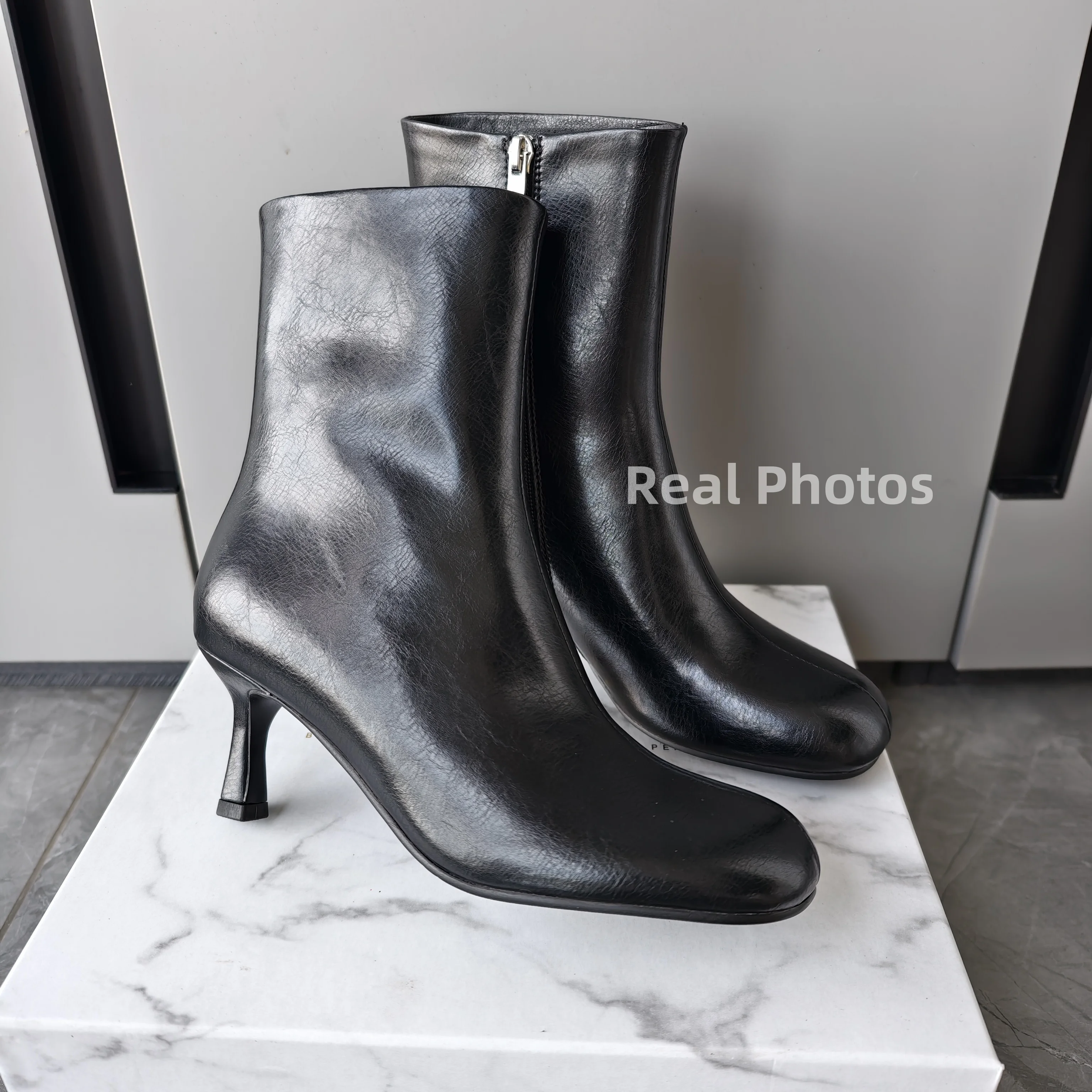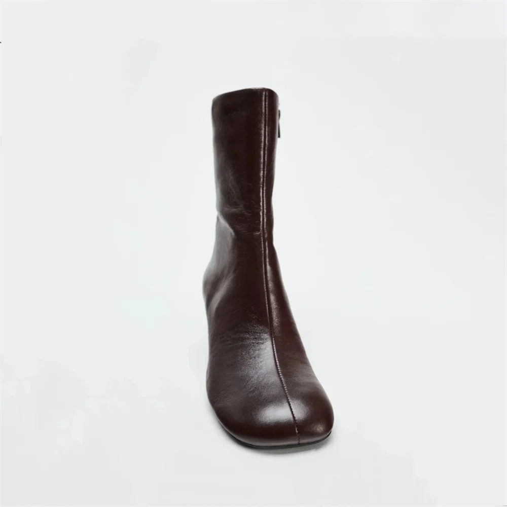 - > Fedonas moda feminina couro genuíno fino salto alto quente outono inverno botas de tornozelo dedo do pé redondo curto elegante botas curtas sapatos