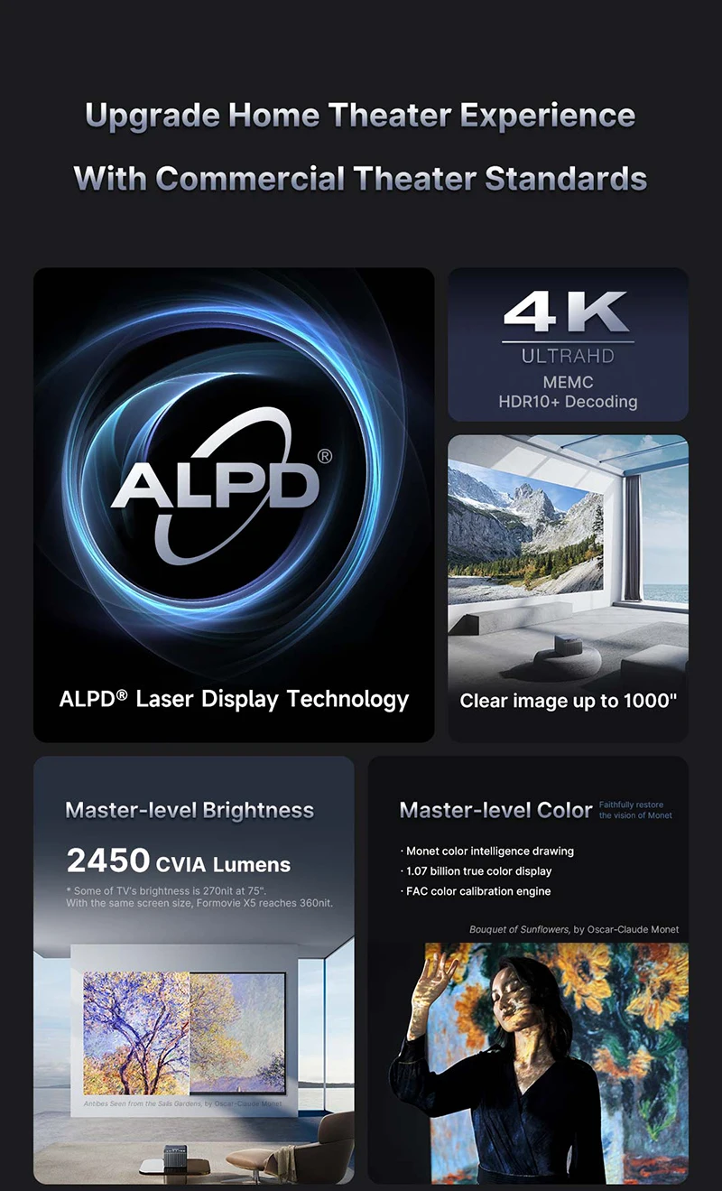 - > Formovie X5 Projetor Laser Triplo Nativo 4K 2450CVIA 4500ANSI Lumen DLP Portátil DTS-HD Teatro Dolby Vision Para Home 4K Cinema