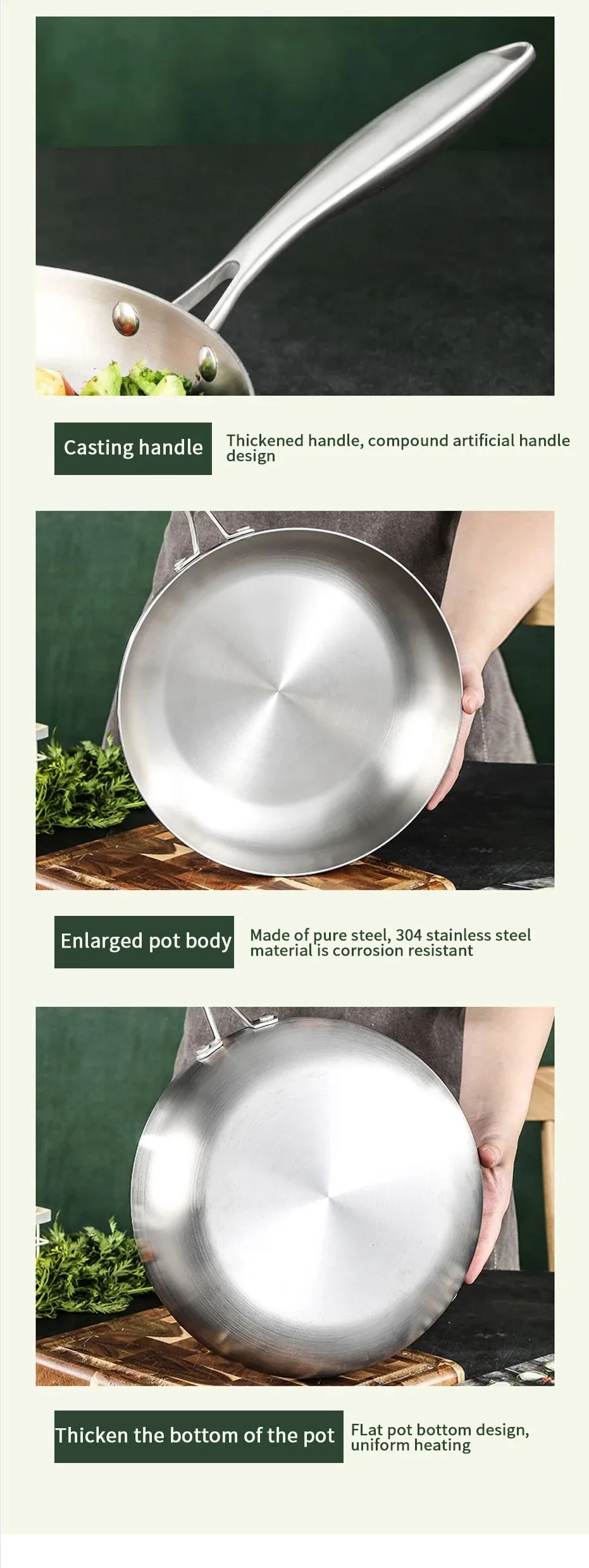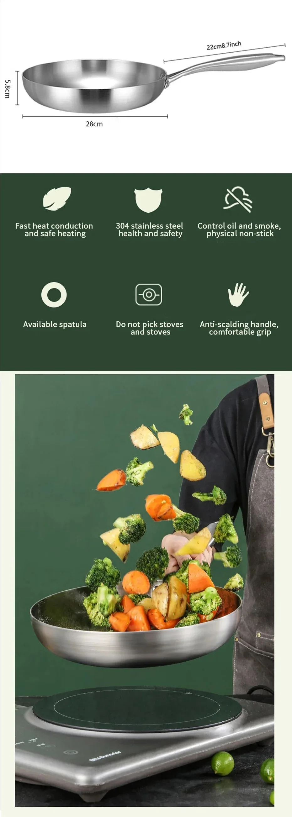 ●Várias opções de tamanho: frigideira feita de aço inoxidável, o interior da panela antiaderente é material de aço inoxidável 304 de alta qualidade, alcança o estado de separação antiaderente.