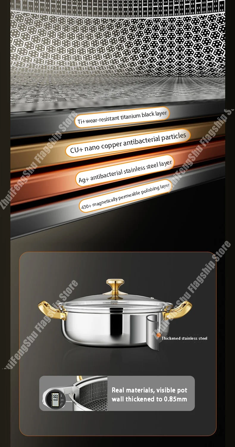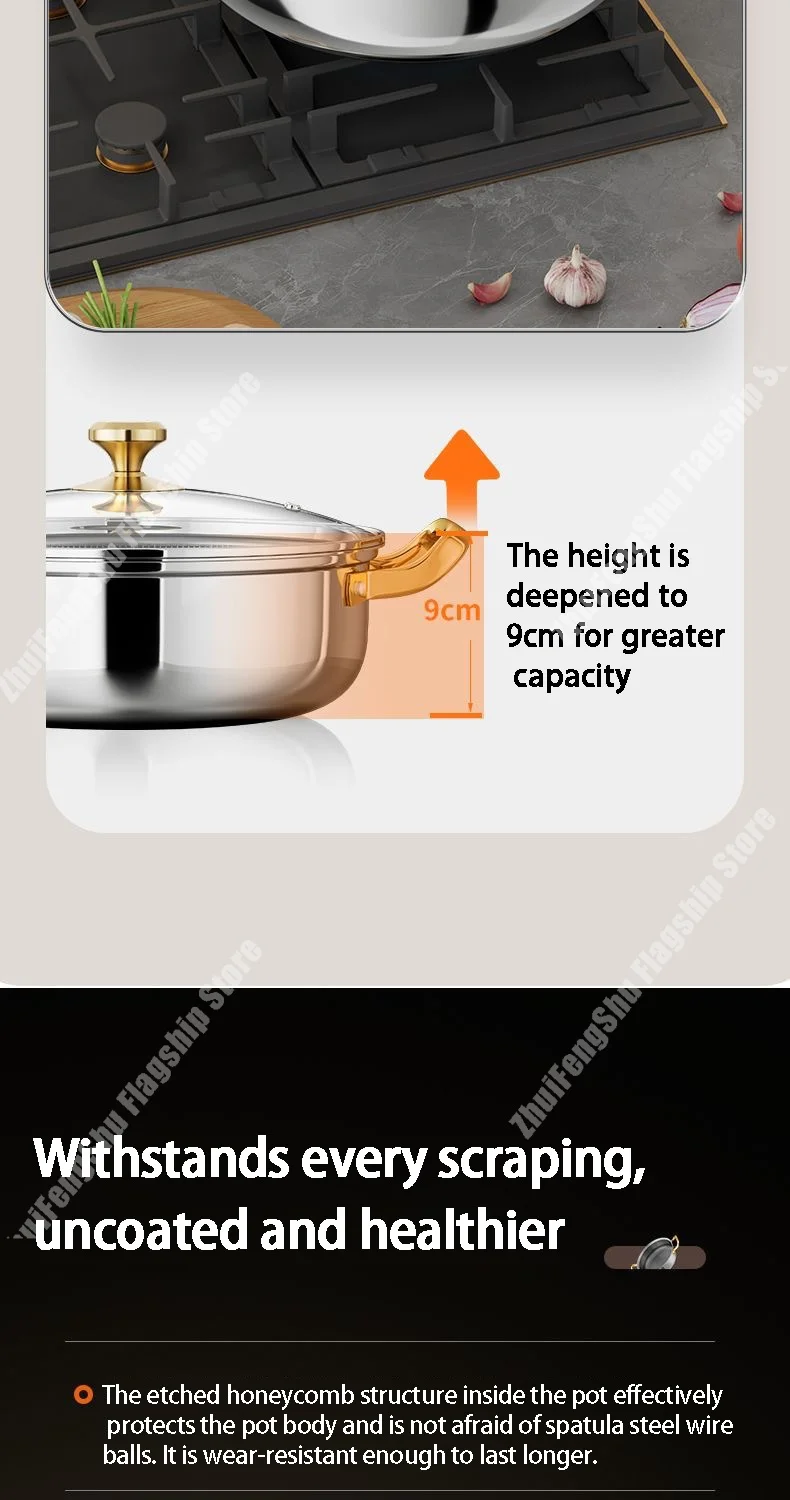 Frigideira de aço inoxidável 30cm, panela de sopa antiaderente wok com tampa, fogão de indução em favo de mel para casa, fogão a gás, panelas de cozinha
