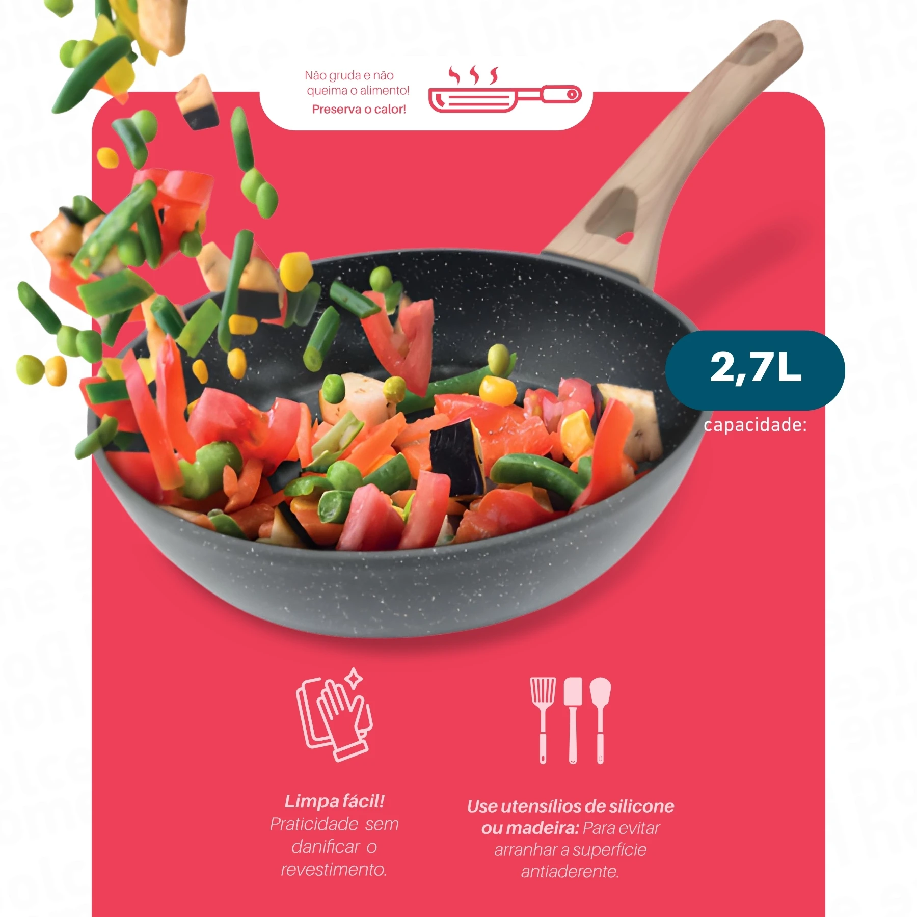 - Fundo triplo indução, economiza energia e cozinha mais rápido, estrutura de alumínio revestida em cerâmica.