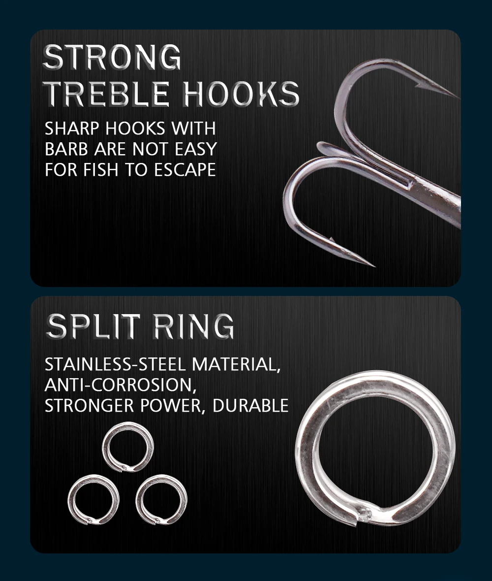 2. Material ecológico:Ela é feita com material ABS de alto desempenho e chumbada de chumbo na cabeça, que oferece iscas de pesca reutilizáveis e sem odor, essas iscas de pesca são incomparáveis em qualidade e durabilidade.