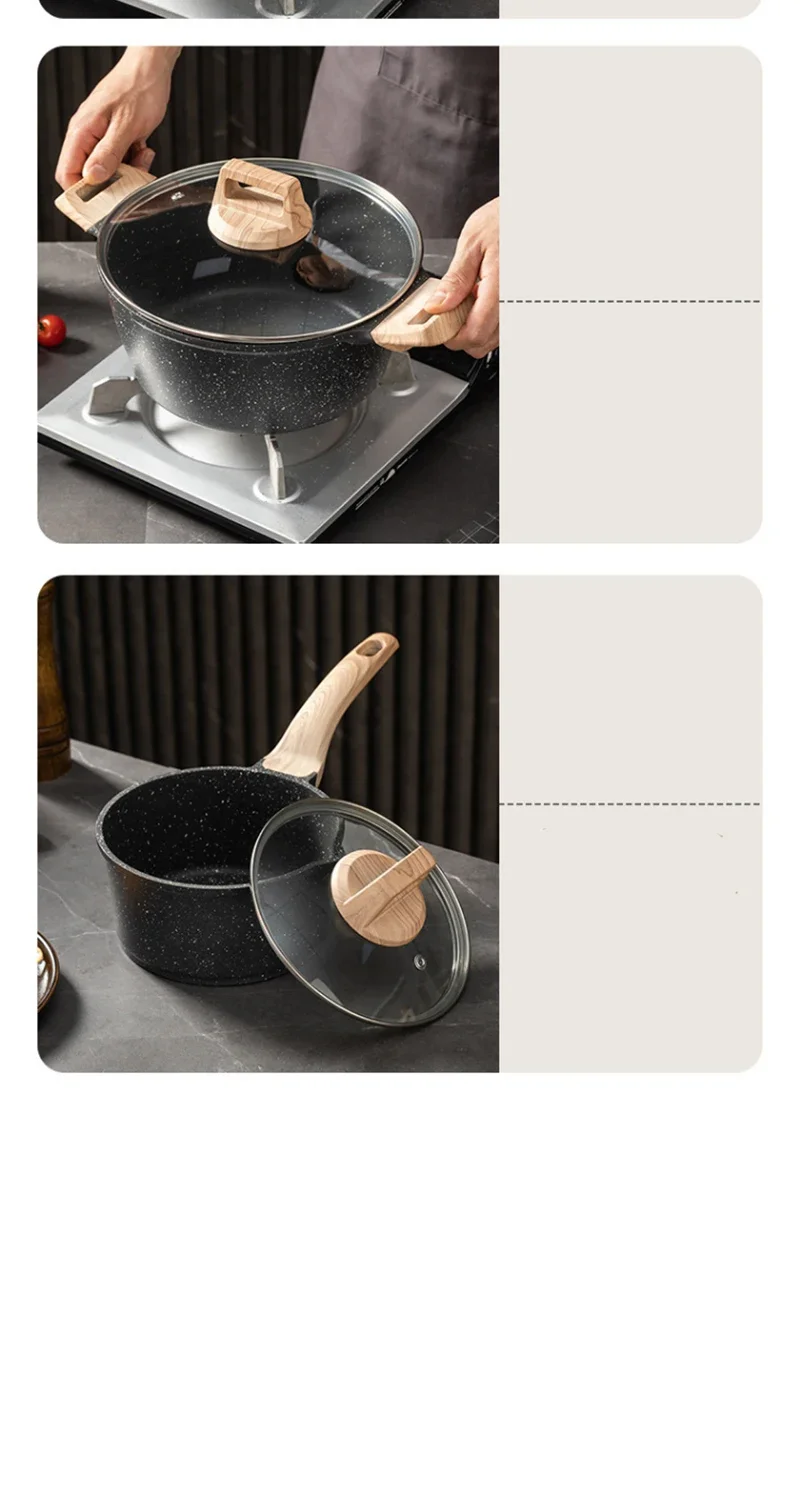 Punho durável do baquelite:Com propriedades resistentes ao calor permitem que você não se preocupe em queimar os dedos em pegar o pote. O design ergonômico da tampa de vidro em perspectiva permite verificar o status da comida na panela a tempo