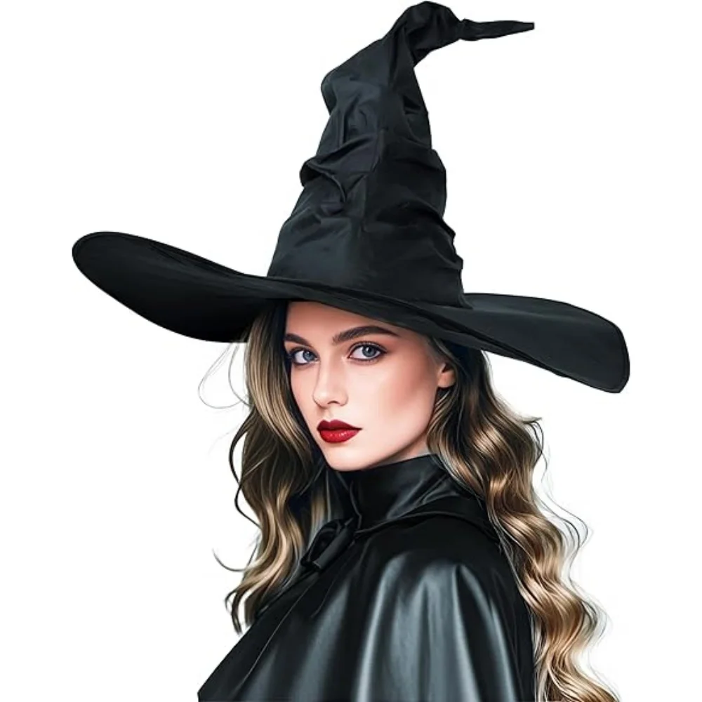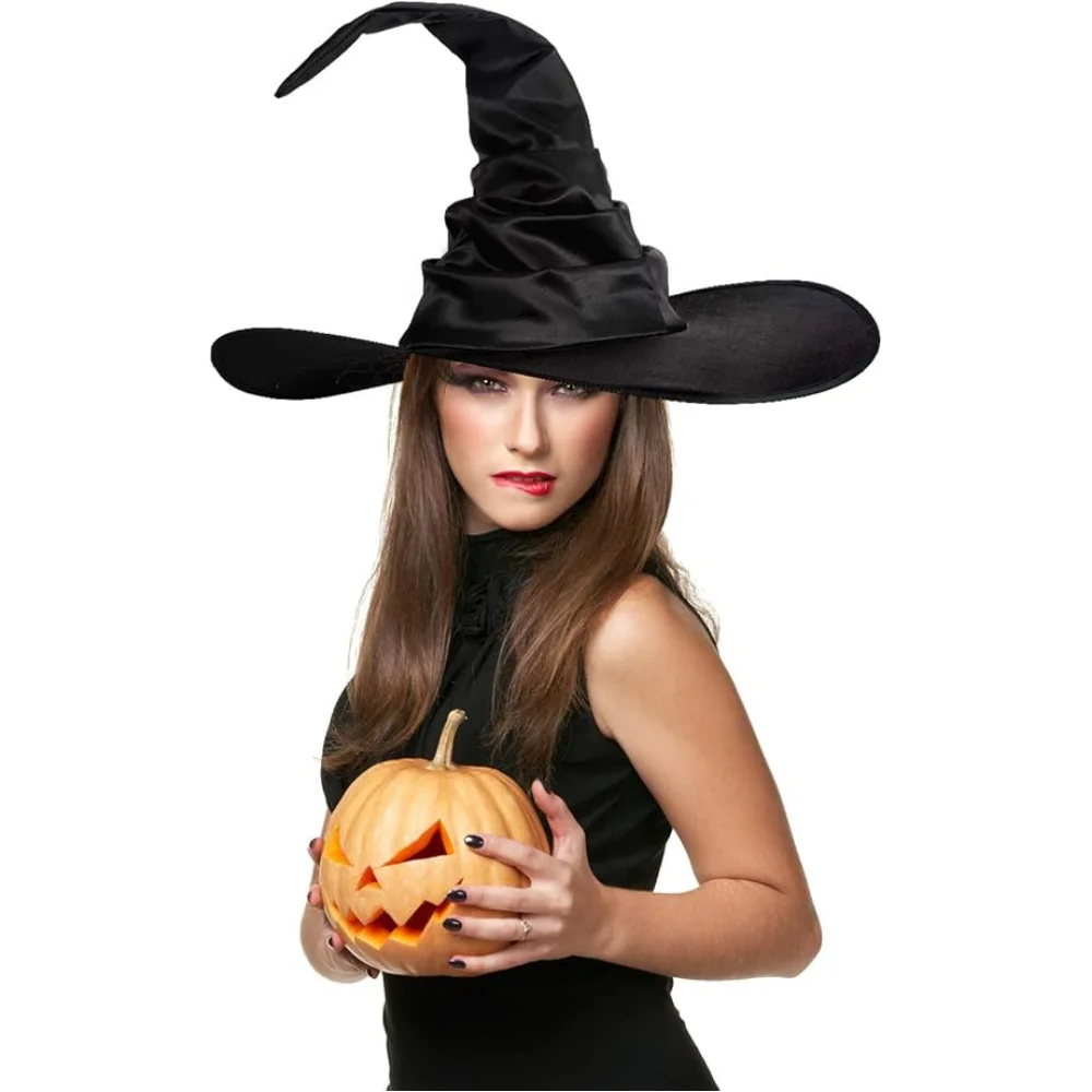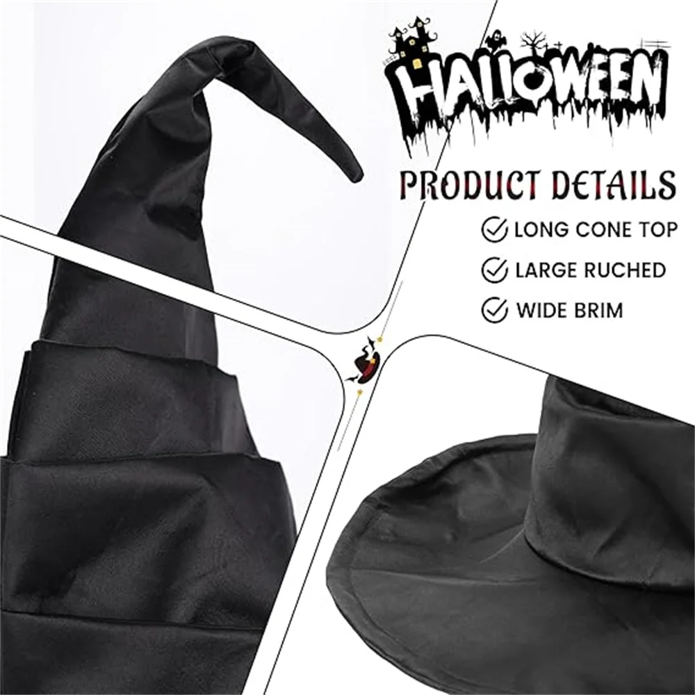 Lindas decorações: este chapéu de bruxa de Halloween é projetado com formato de chapéu de bruxa tradicional, vem com top pontiagudo, franzido grande e aba larga, apresentado com preto, simples, mas clássico, acessório de fantasia indispensável para ajudá-lo a se vestir como uma bruxa, o que irá ajudá-lo a chamar a atenção dos outros facilmente