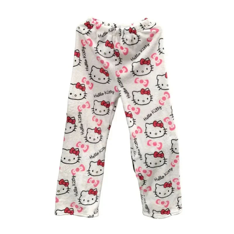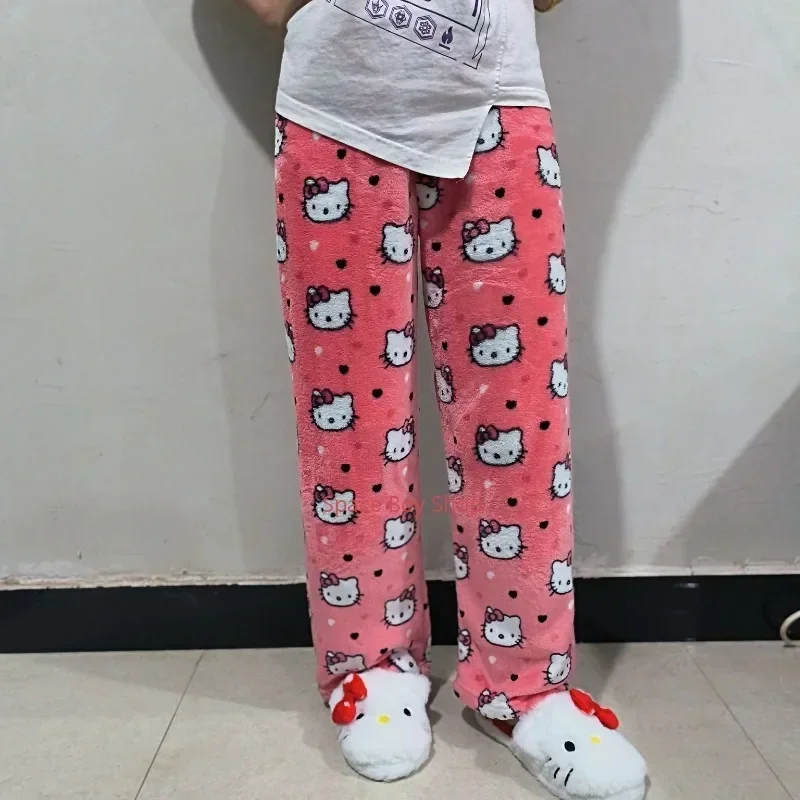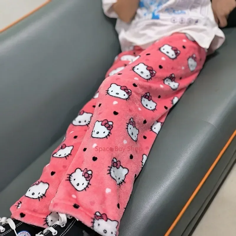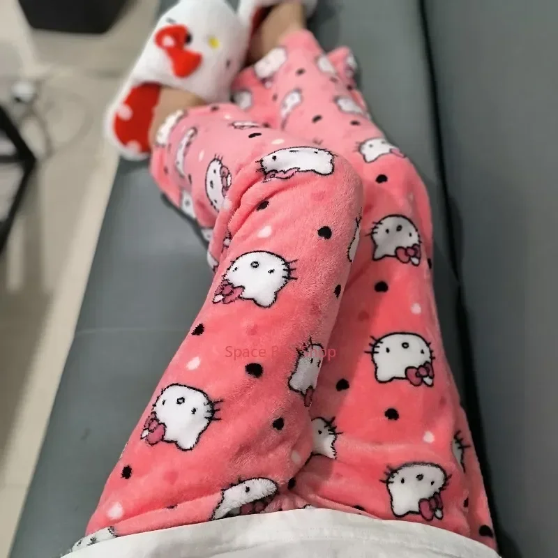 - > Halloween engrossar olá kitty calças de pijama sanrio anime velo duplo elástico tecido macio calças femininas dos desenhos animados presente aniversário