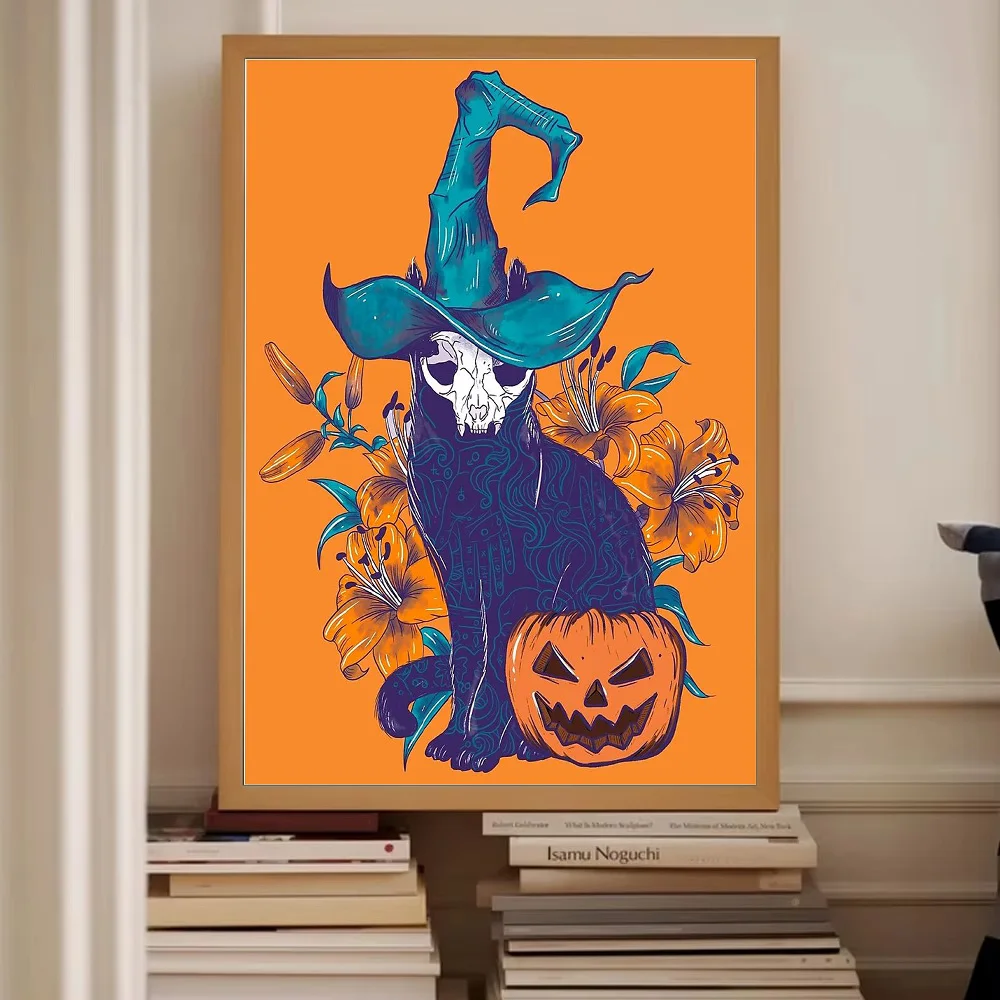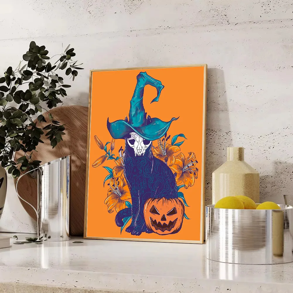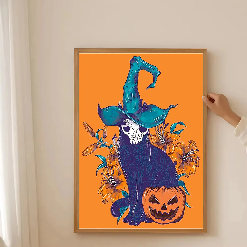 Halloween gato lona arte da parede assustador preto gatinho abóbora decoração de casa gótico horror impressão witchy quarto presente estético