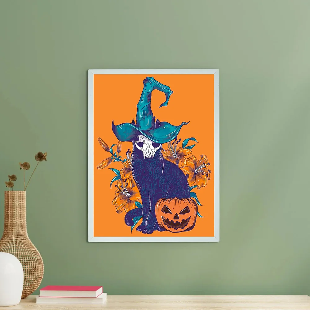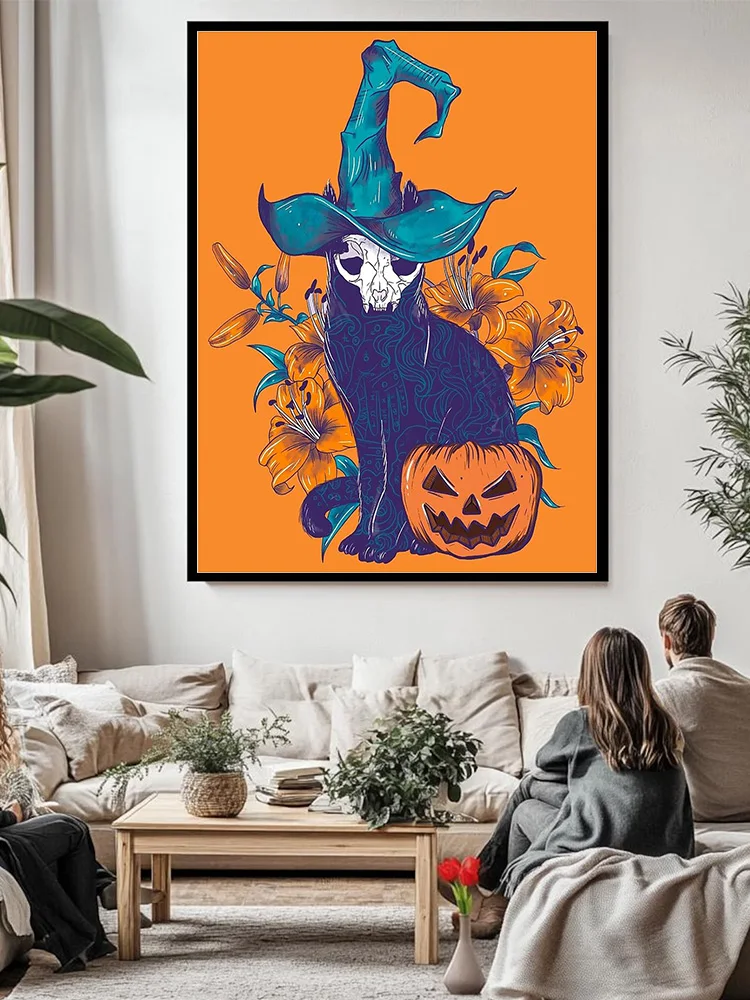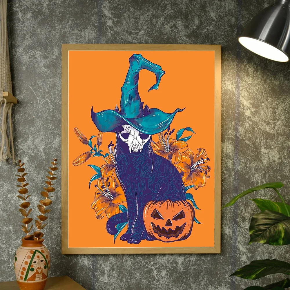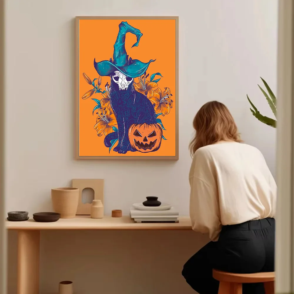 Halloween gato lona arte da parede assustador preto gatinho abóbora decoração de casa gótico horror impressão witchy quarto presente estético
