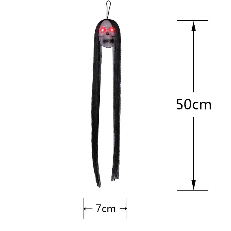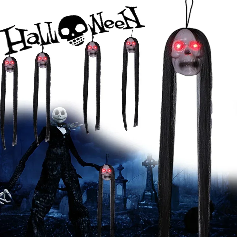 - > Halloween pendurado crânio fantasma com cabelo longo olhos brilhantes terror crânio fantasma casa cabeça esqueleto adereços 2024 decoração de halloween