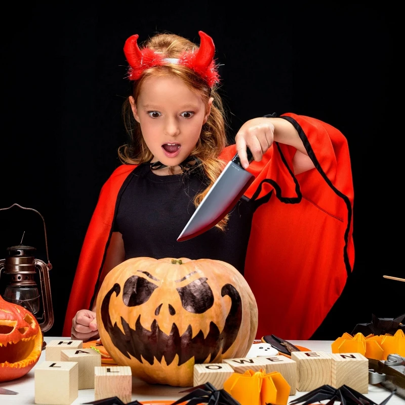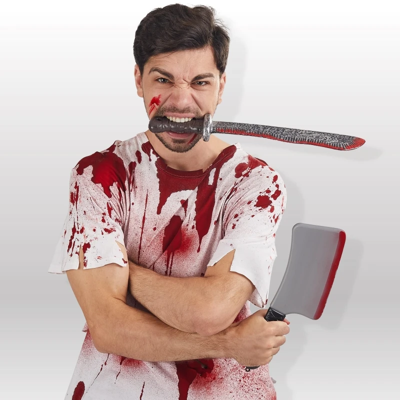 --MATERIAL PLÁSTICO SEGURO: Uma lâmina que não prejudicará você ou ninguém ao seu redor.Este adereço é feito de plástico e é totalmente inofensivo e é puramente um adereço de mordaça para efeito visual assustador.
