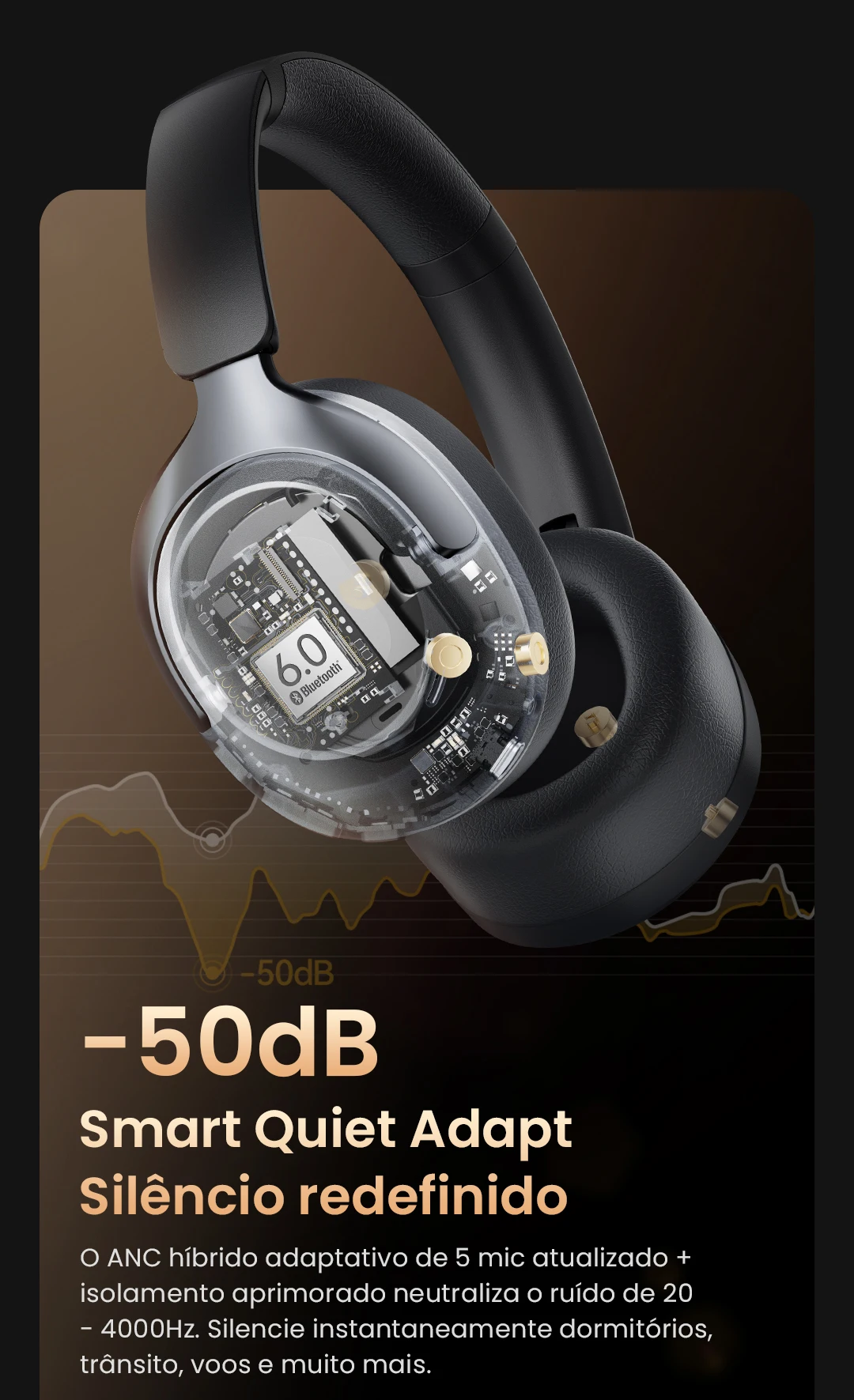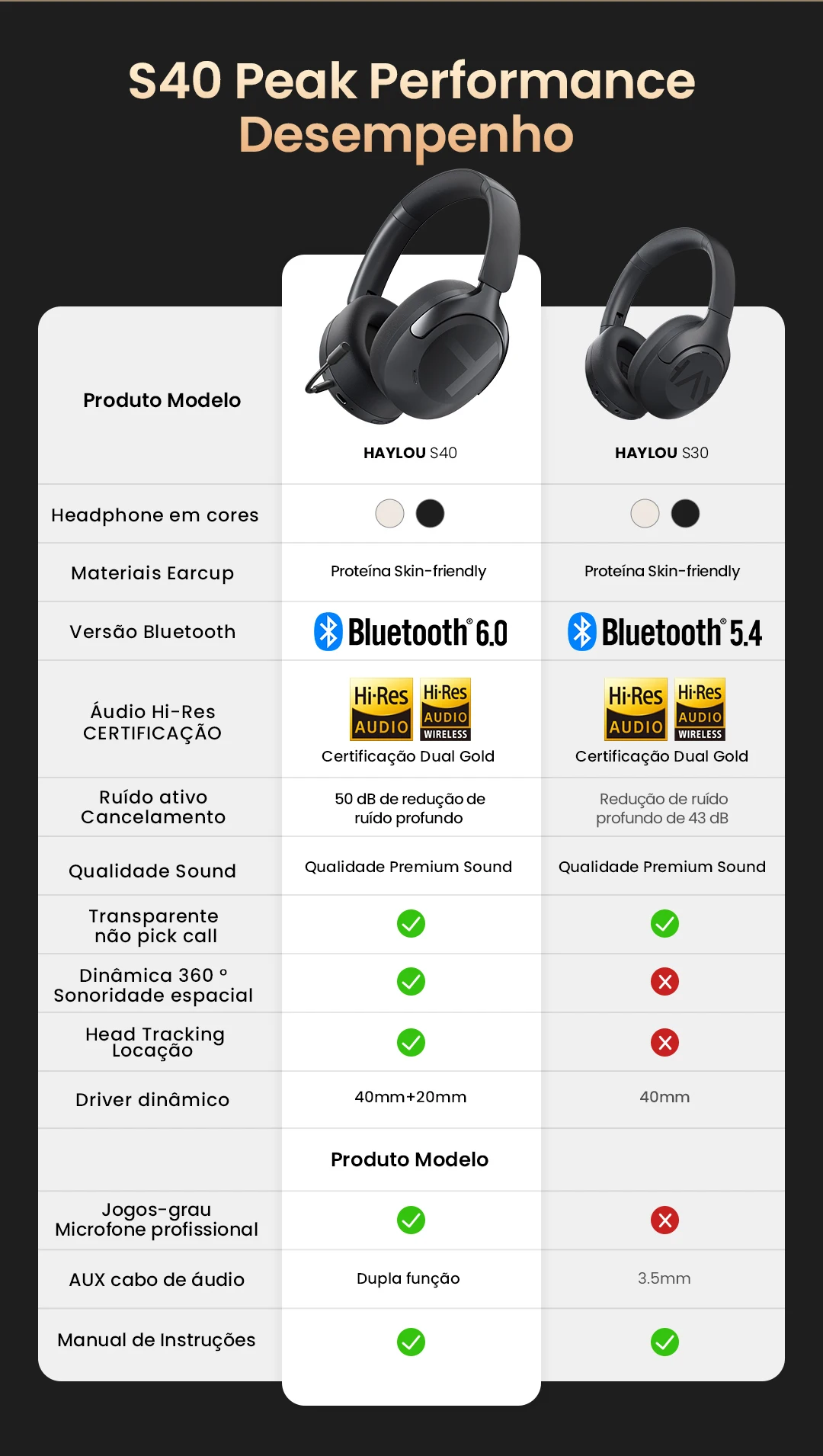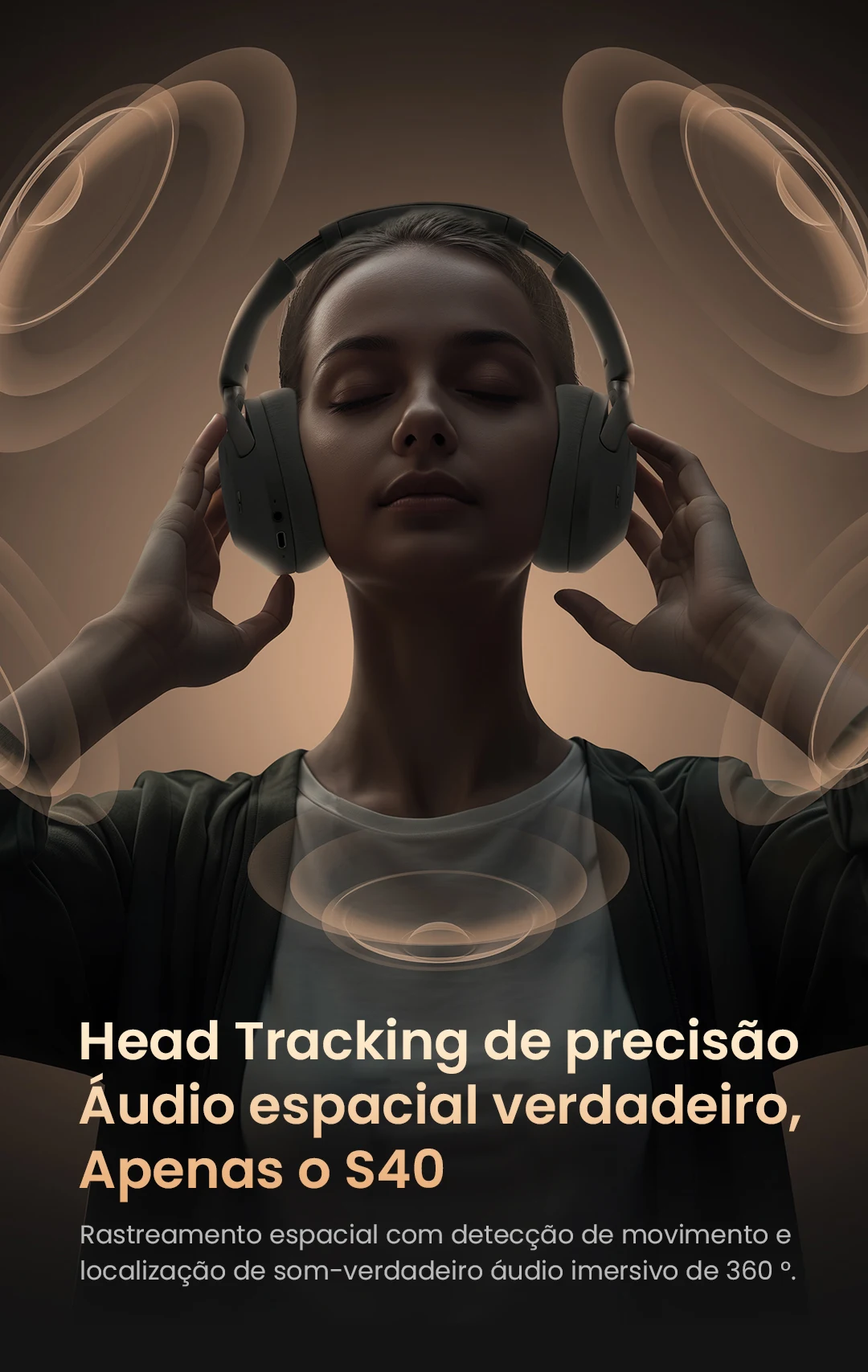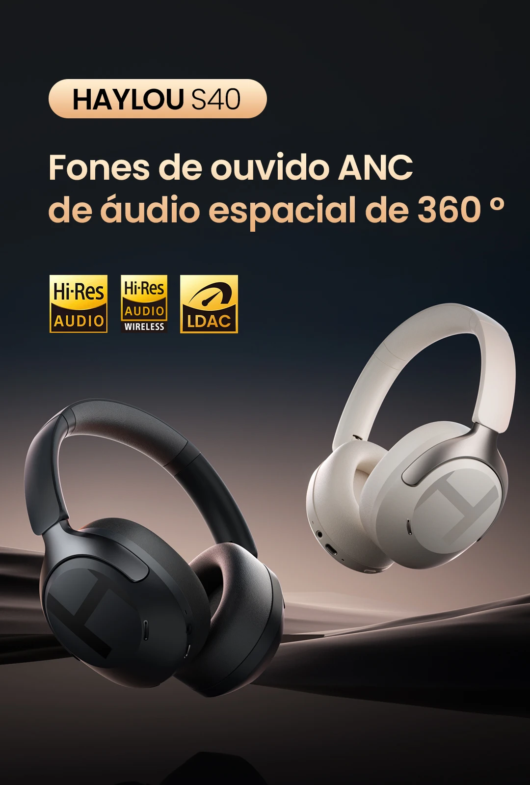 HAYLOU S40 ANC Fone de ouvido sem fio 50dB com cancelamento de ruído alta resolução 360° Fone de ouvido de áudio espacial com fone de ouvido LDAC Bluetooth 6.0 com duração de reprodução de 90H