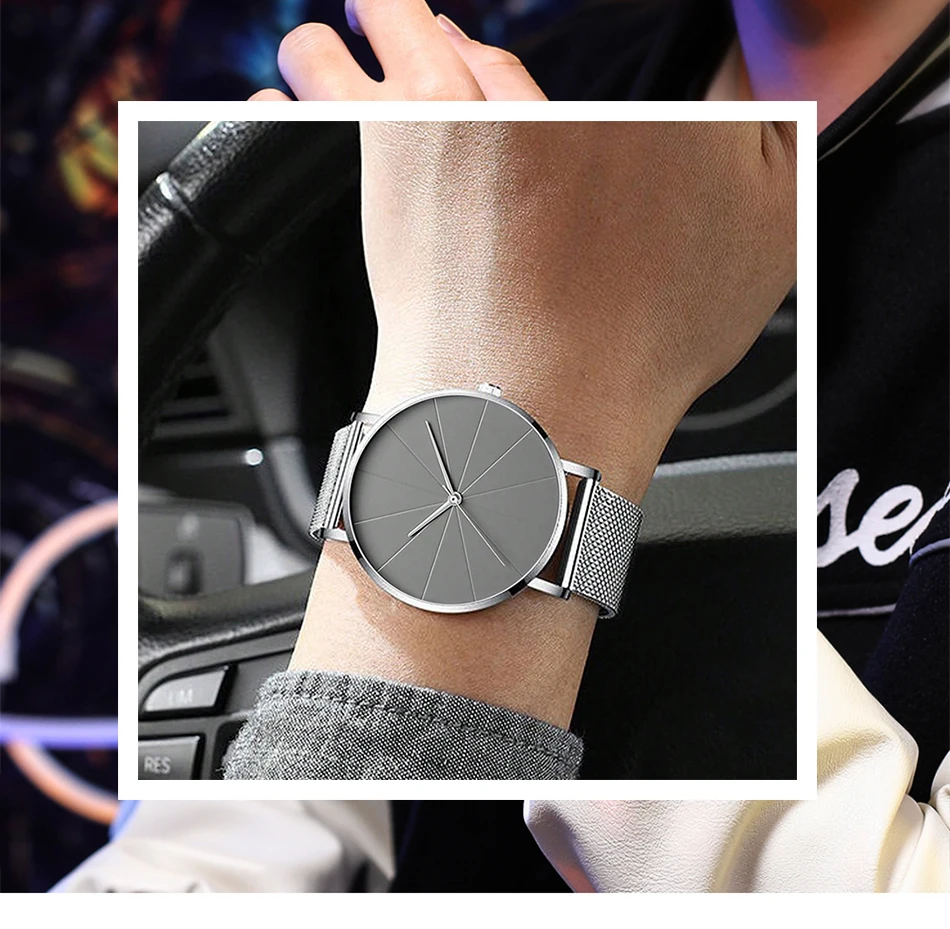 Homens de aço inoxidável quartzo relógio de pulso, prata pulseira relógios, malha cinto, calendário, negócio, luxo, moda