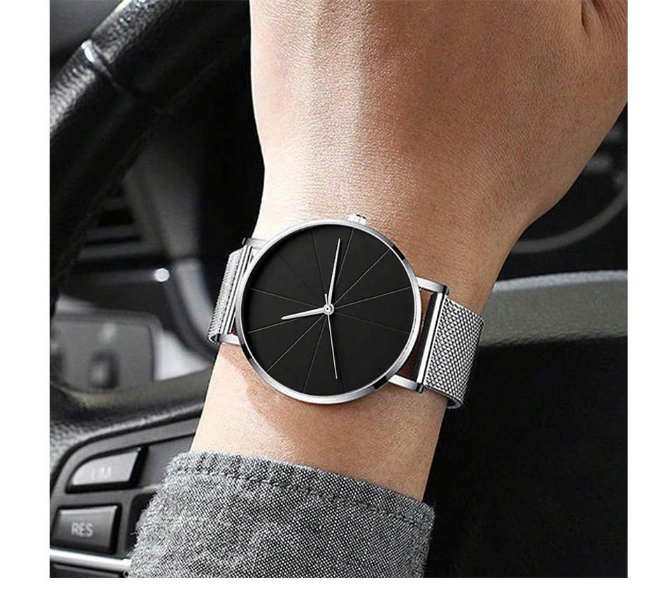 - > Homens de aço inoxidável quartzo relógio de pulso, prata pulseira relógios, malha cinto, calendário, negócio, luxo, moda
