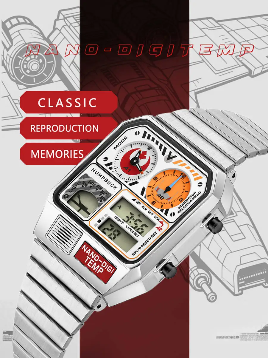 Este relógio multifuncional DIGITEMP inclui funcionalidade de hora dupla para viajantes, exibição de temperatura em Celsius, cronômetro e cronômetro e calendário perpétuo. Material de aço inoxidável, proporcionando uma sensação superior em comparação com o original.