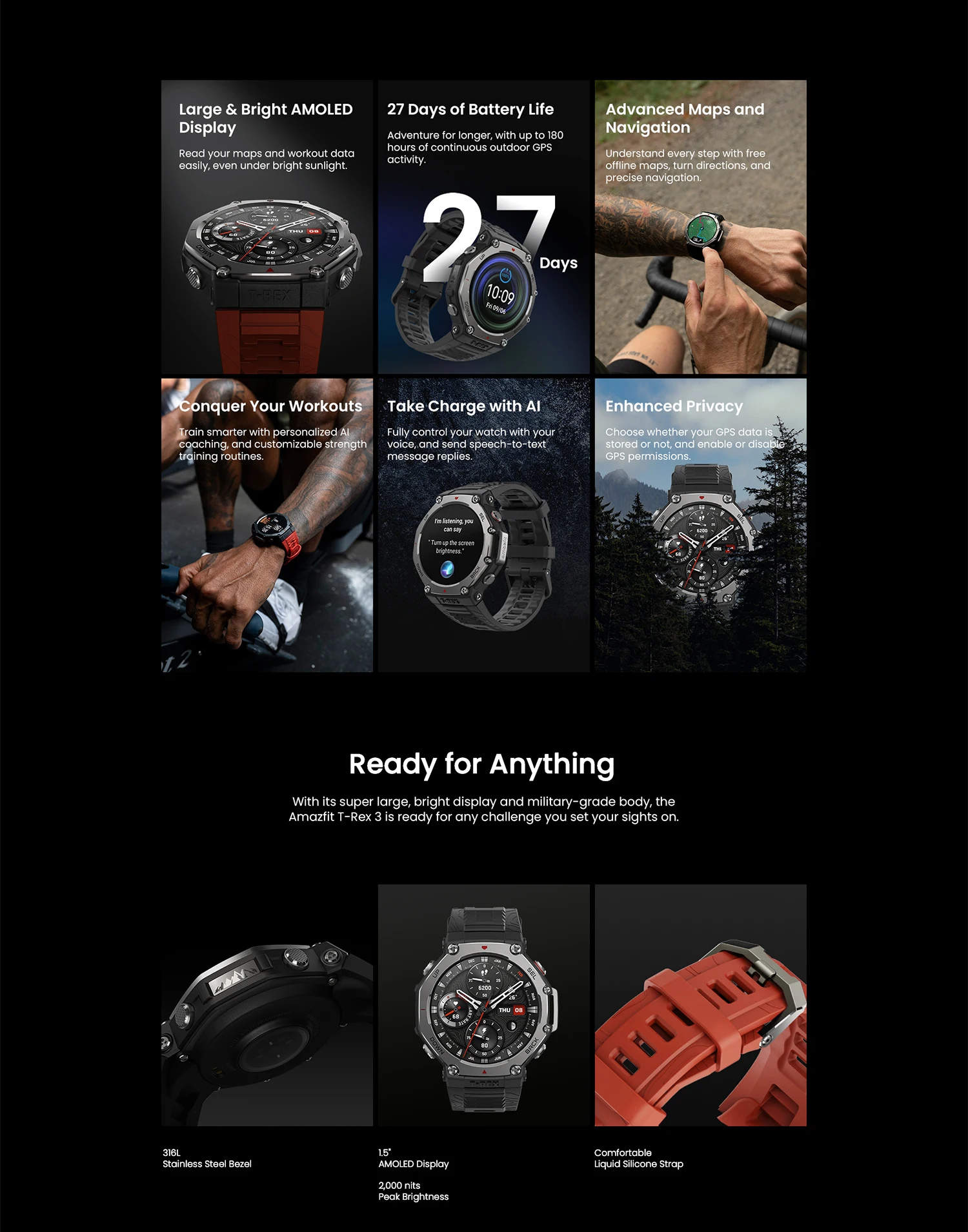 - > in stock 2024 Amazfit t-rex 3 t rex 3 smartwatch ao ar livre 48mm display amoled 6 sistemas de satélite banda dupla gps 170 modo esportivo relógio inteligente