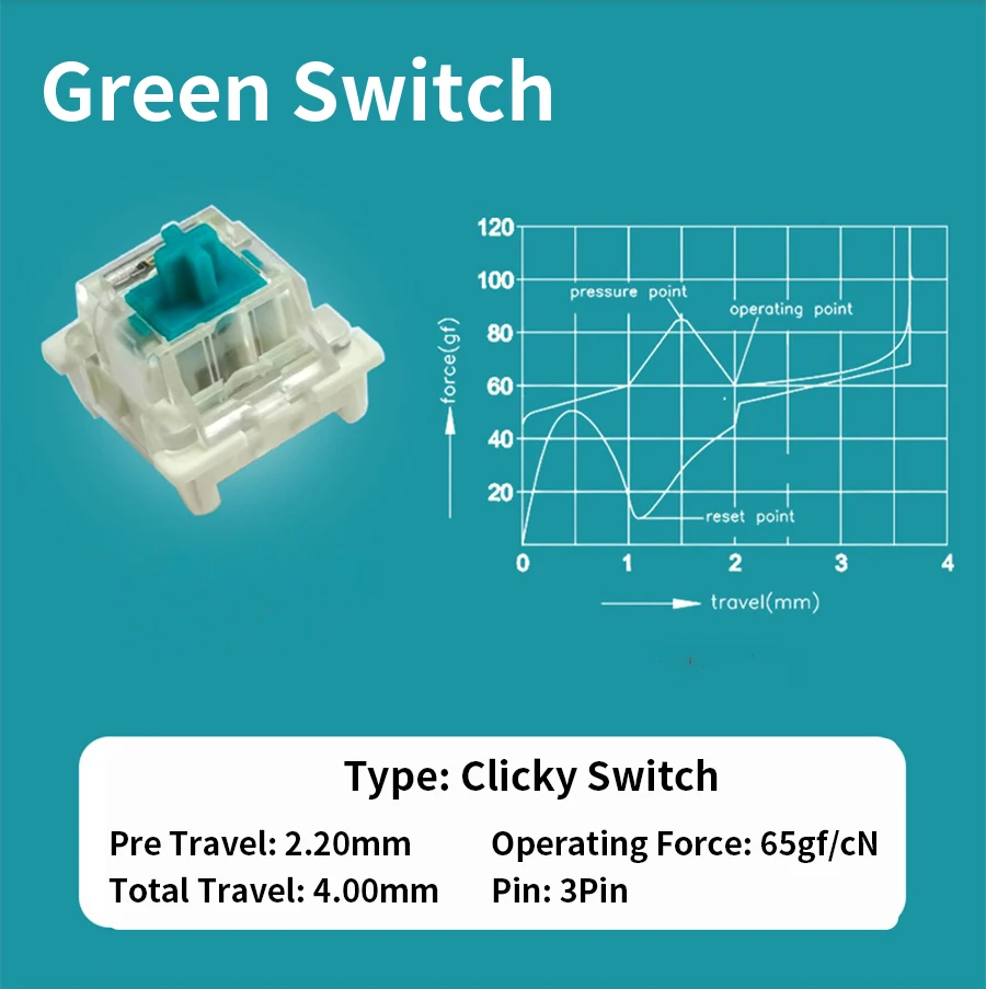 Descrições Semelhante ao Outemu Blue Switch, a força operacional é mais pesada que o Outemu Blue Switch, com um som atraente de "clique" e o rebote é mais poderoso.Pode ser usado em chaves grandes.