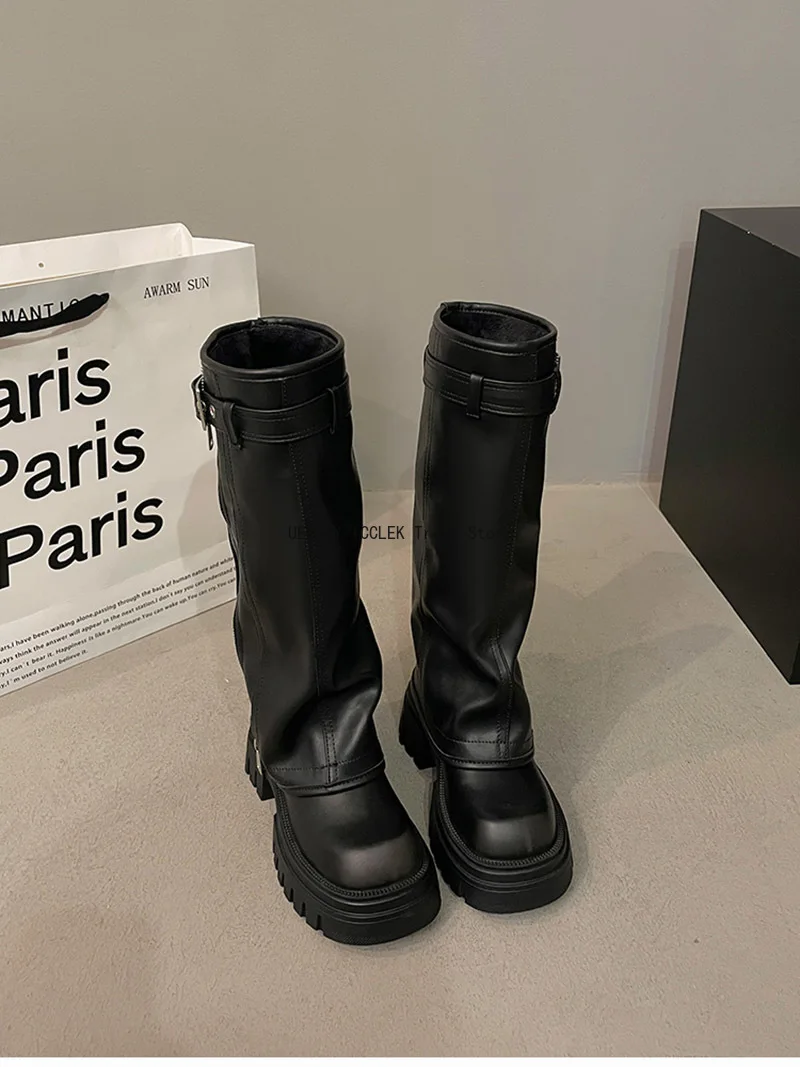Inverno feminino botas de motociclista moda fivela de cinto senhoras elegante plataforma longo tubo botas casuais femininas joelho botas altas