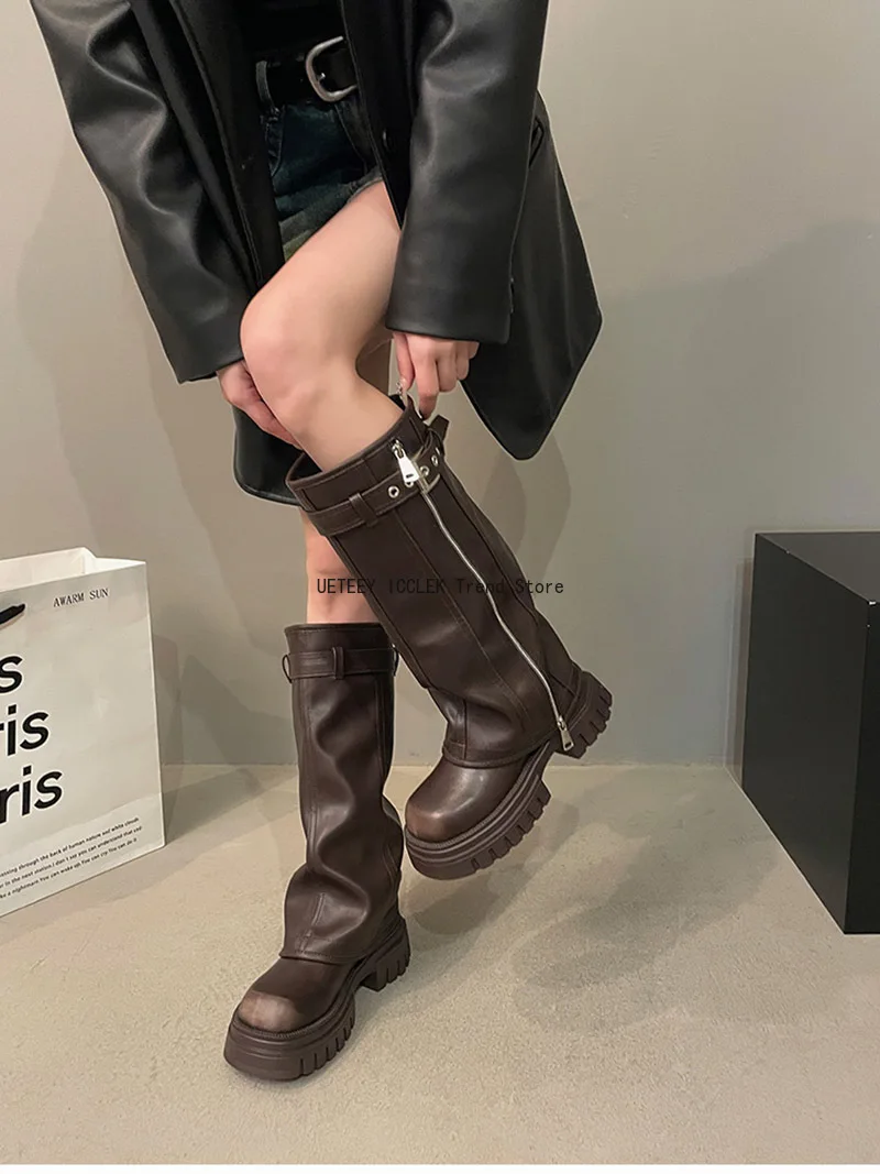 - > Inverno feminino botas de motociclista moda fivela de cinto senhoras elegante plataforma longo tubo botas casuais femininas joelho botas altas