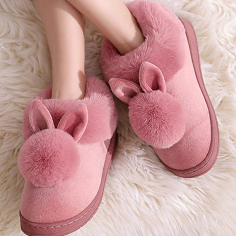 - > Inverno quente casa botas de pele das mulheres interior casa sapato de coelho orelhas peludas calçados quarto interior saltos planos botas de tornozelo macio