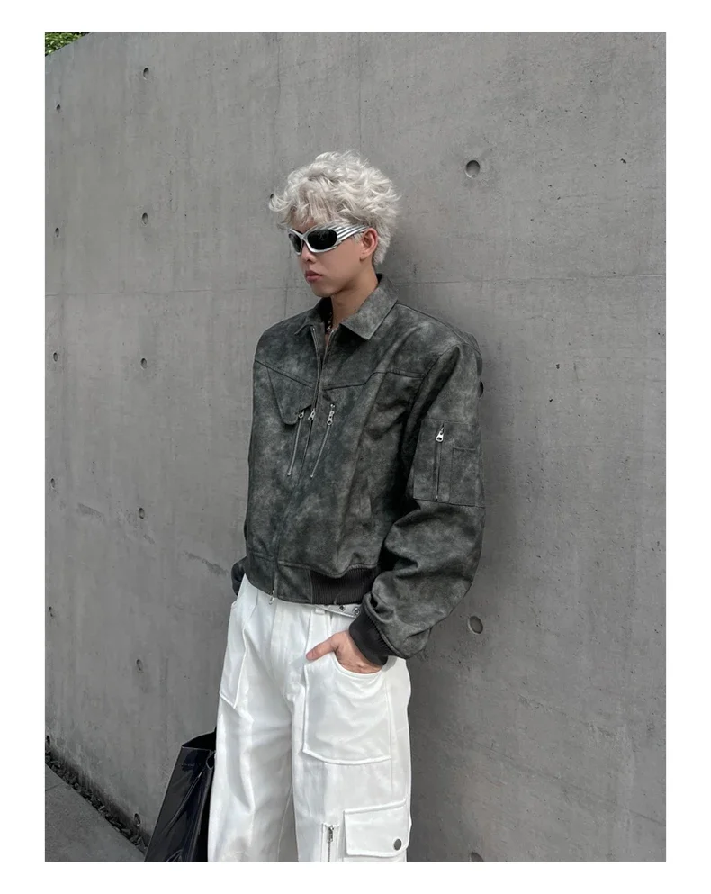 Jaqueta de couro PU recortada masculina, colarinho virado para baixo na moda, cor gradiente, casaco retrô com zíper, outwear de motocicleta masculina, primavera
