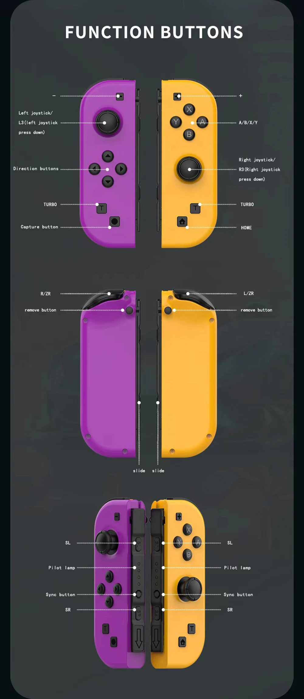 With TURBO Function: press and hold the Turbo key+UP, DOWN, LEFT, RIGHT, ZL, L with the left handle, or press and hold the Turbo key+A, B, X, Y, ZR, R with the right handle, and then press and hold the set consecutive key. At this time, this key has the consecutive hair function. This is manual consecutive hair, and then press and hold the Turbo key+UP, DOWN, LEFT, RIGHT, ZL, L, A, B, X, Y, ZR, R again for automatic consecutive hair. Press and hold the Turbo key+UP, DOWN, LEFT, RIGHT, ZL, L A, B, X, Y, ZR, R cancel the continuous firing function. Press and hold the Turbo key for 5 seconds to clear all the continuous firing key functions. There are three gears in the TURBO speed, fast/medium/slow. Press and hold the TURBO+rocker to increase the burst frequency upward, and press and hold the TURBO+rocker to decrease the burst frequency downward. The default is the slow speed