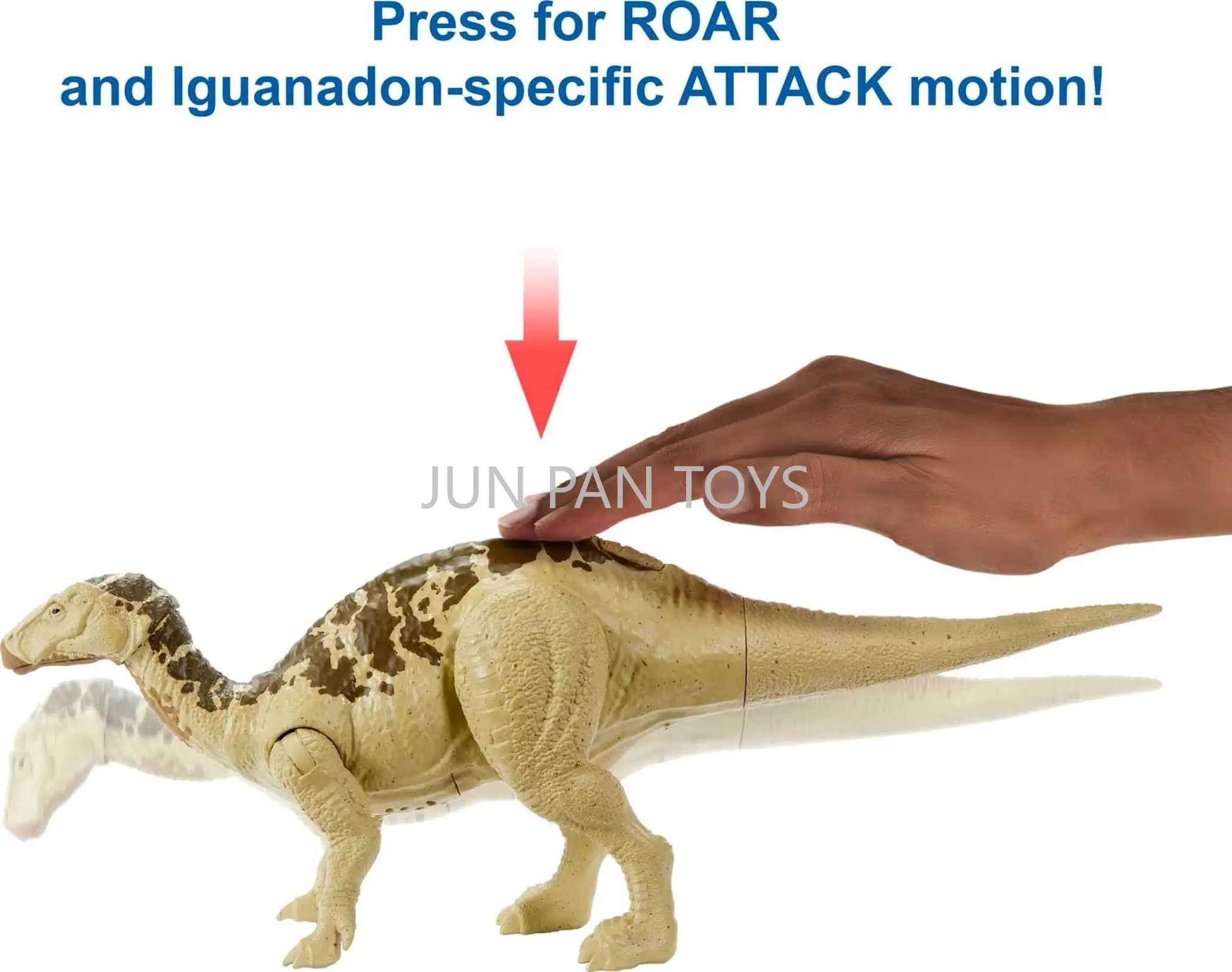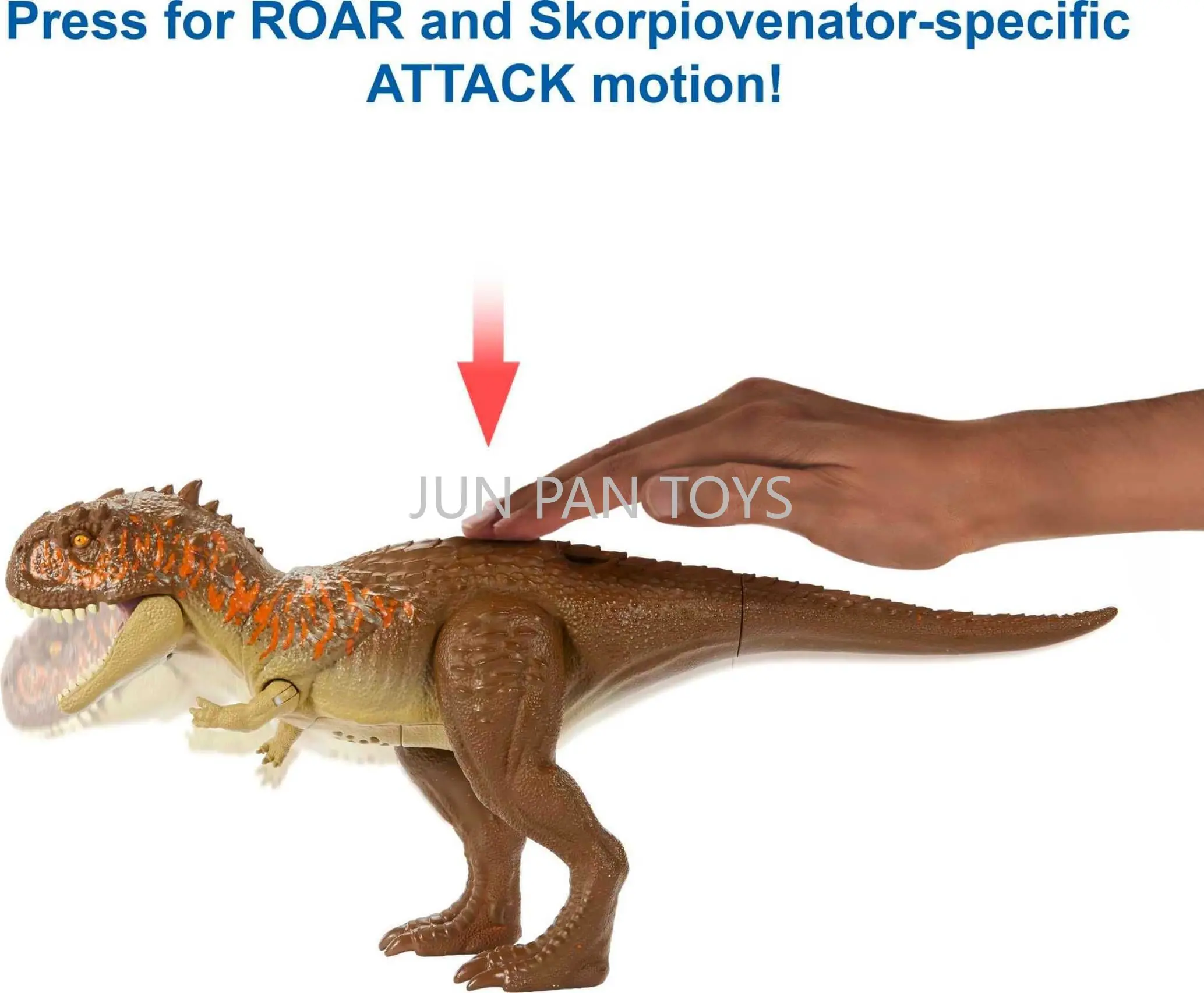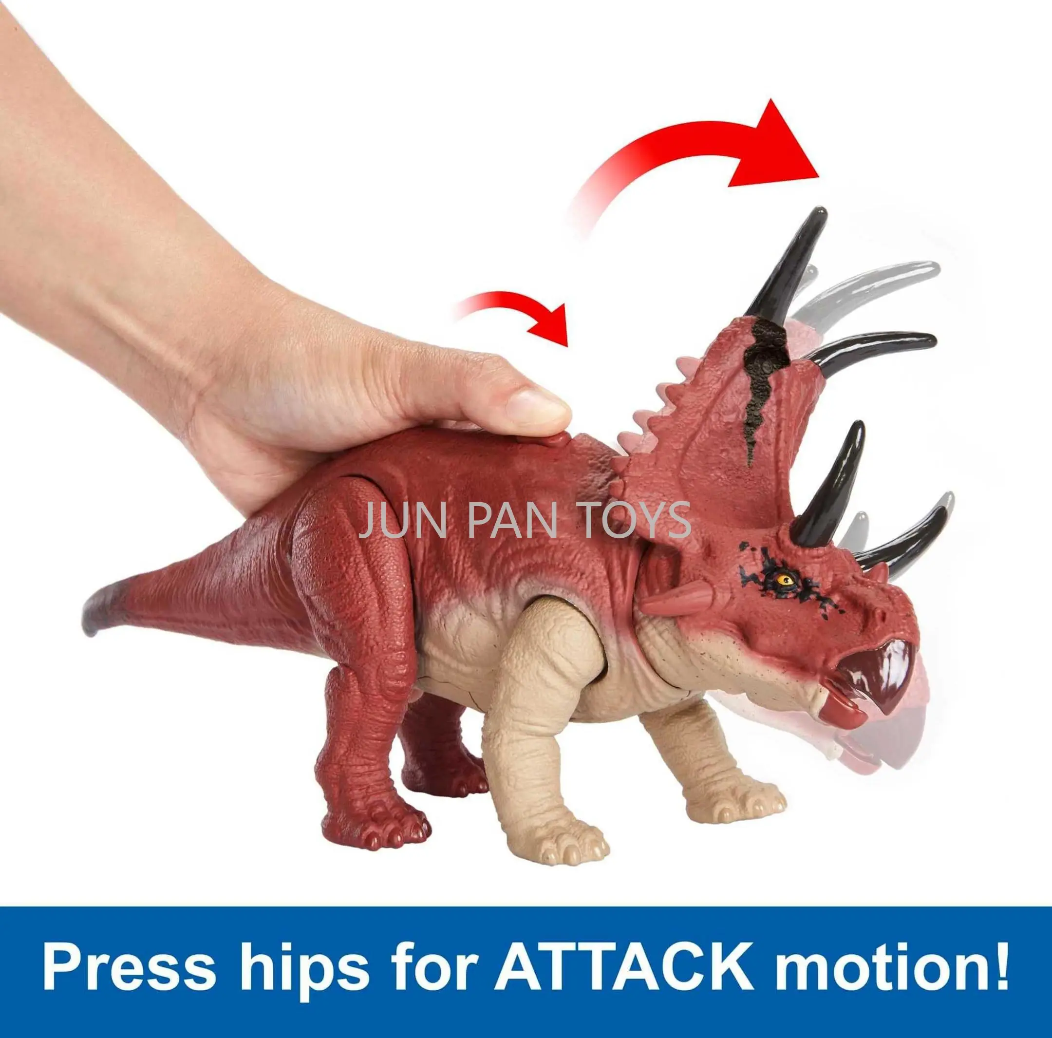 Cada brinquedo de dinossauro de tamanho médio tem um movimento de ataque específico para as espécies, desde batedores de cauda surpresa até chomps de alongamento do pescoço e pontas de cabeça, para um jogo de batalha realista.Basta pressionar a área do quadril para ativar.