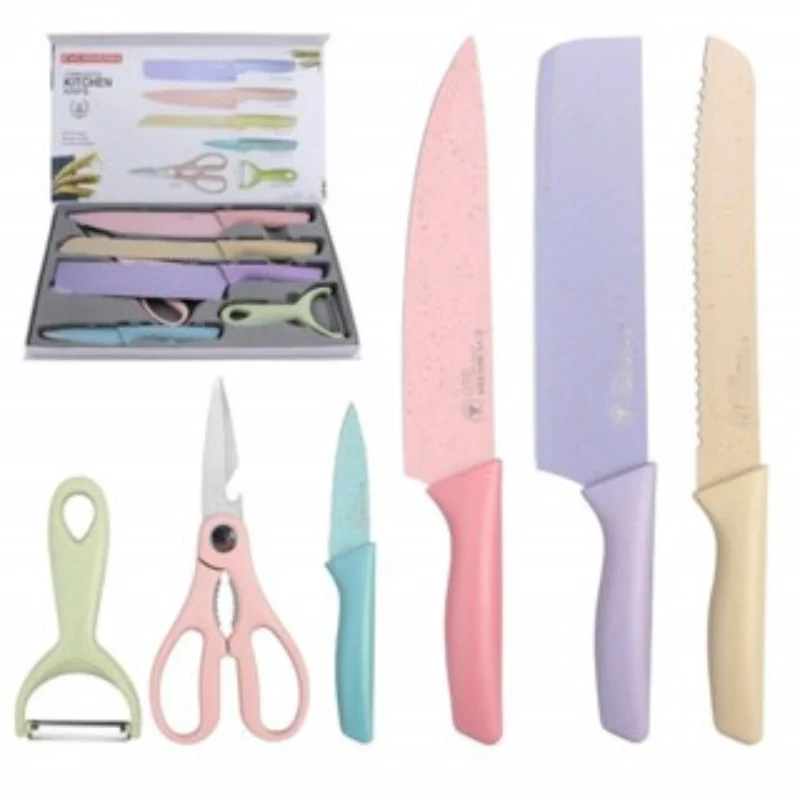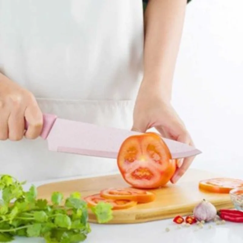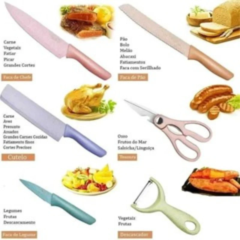 Cabo leve e antiderrapante O conjunto de facas de cozinha usa um material de trigo puro natural, ecológico, saudável, bonito, muito leve e antiderrapante. O cabo para cada faca é ergonomicamente projetado, muito forte, bem equilibrado, confortável e seguro de usar.Fácil de limpar, economiza e longa durabilidade Esta lâmina afiada e cabo resistente são muito fáceis de limpar após o uso. Depois de limpar estas facas com água, limpe-as imediatamente com uma toalha e seque-as para manter o melhor desempenho para o próximo uso.