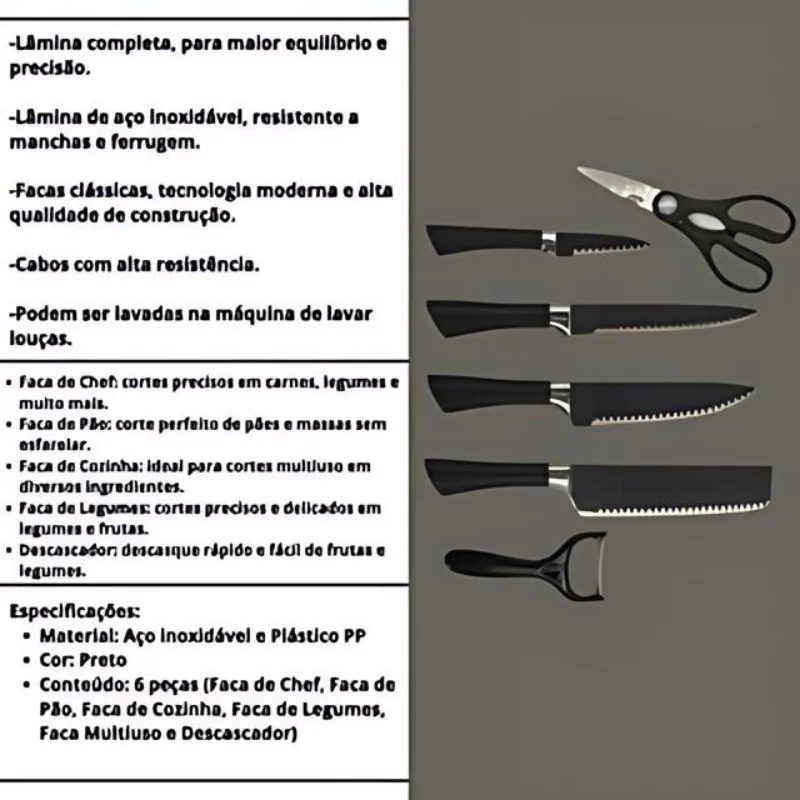 • 1 Conjunto De Facas 6 Peças Aço Inox e Plástico Linha Chefe