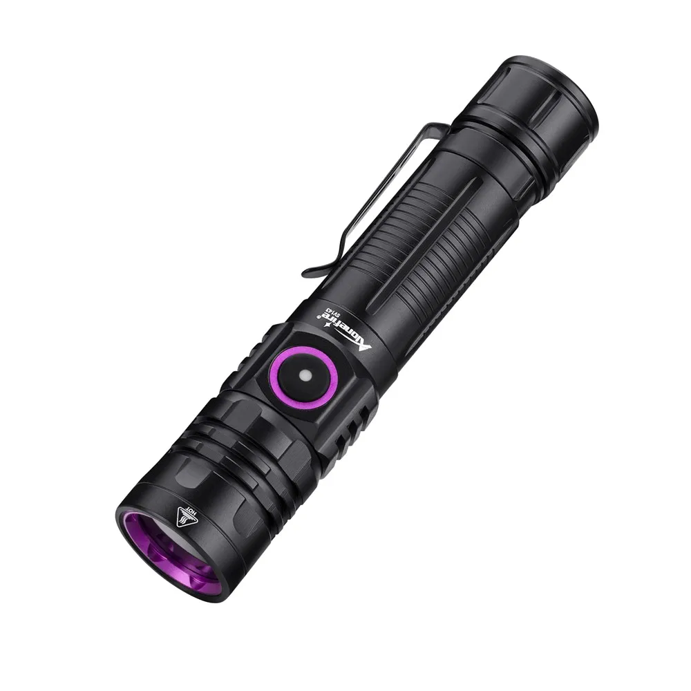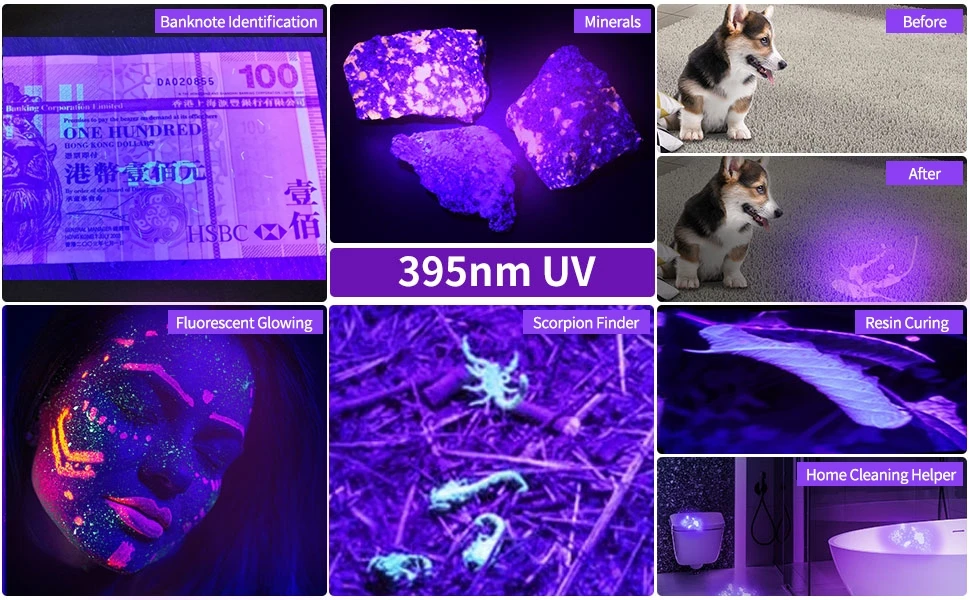A luz ultravioleta de 365 nm é invisível a olho nu, de modo que não é tão BRILHANTE quanto a lanterna de 395 nm, mas mais perfeita para detecção de alta demanda, como agentes fluorescentes e código de segurança.UV de 365 nm é o verdadeiro espectro de detecção dedicado.Pode ser usado com luz natural e tem melhor desempenho no escuro com pouca vazão de luz visível.pode ser usado como detector de urina para animais de estimação (cachorro/gato)/escorpião/varidor/fluorescente/detector/moeda/licença/cartão/autenticação de passaporte/manchas de óleo/detector de vazamento/vuro ect.