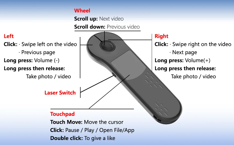 - > Laser sem fio bluetooth mouse controle remoto tiktok curto vídeo ppt página girando controlador telefone móvel tablet tipo-c & usb a