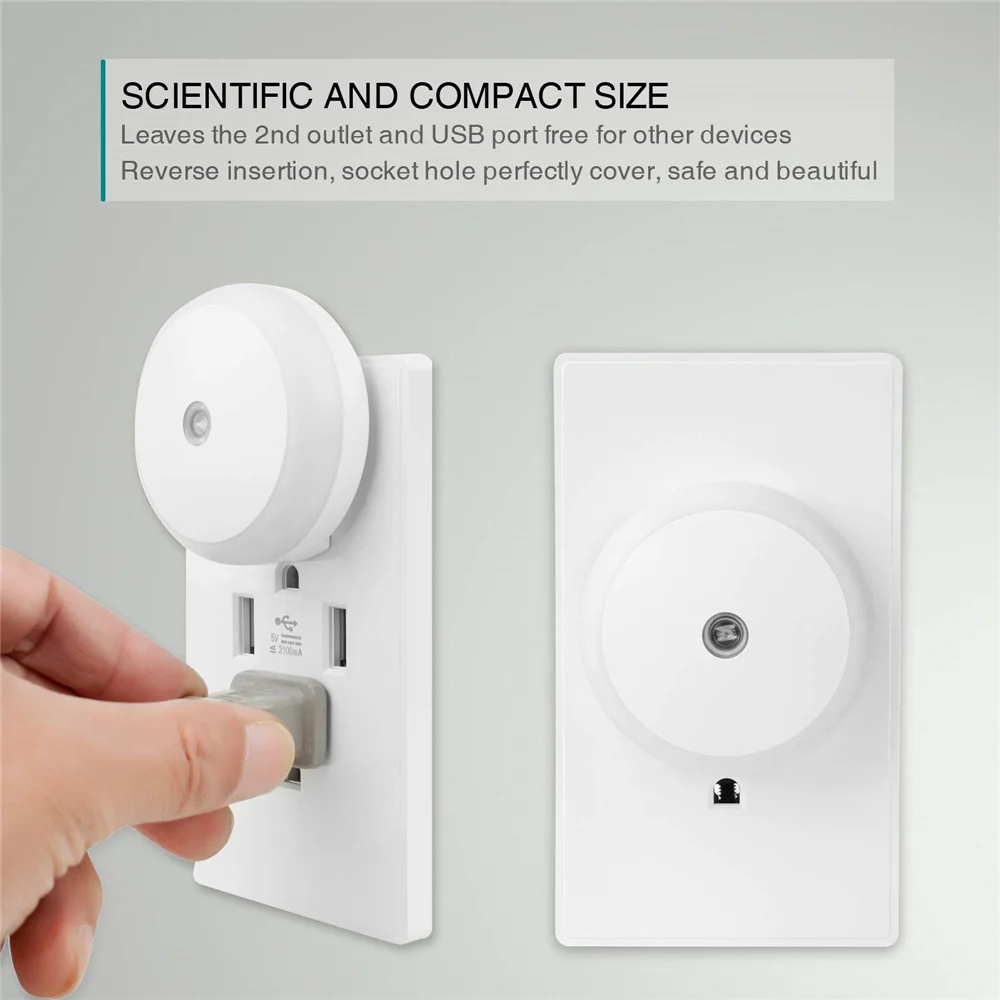 Compact size, small night light plug into wall outlet and leaves space for the other socket perfectly. Portable for home use or traveling to unfamiliar places.
